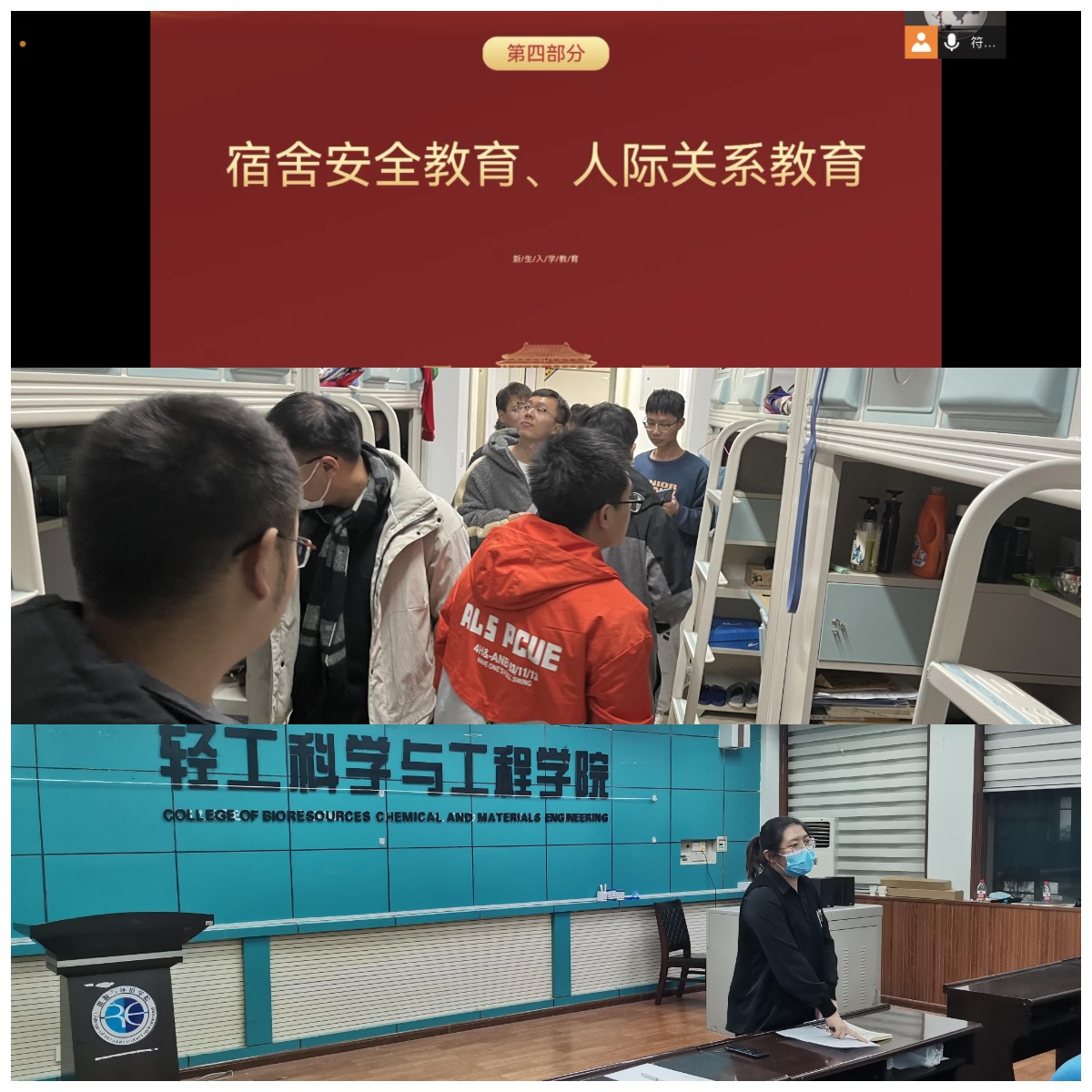 結(jié)合生動(dòng)案例,強(qiáng)化安全認(rèn)知。研究生輔導(dǎo)員利用新生入學(xué)教育、“輕工一課”專題教育等契機(jī),以實(shí)驗(yàn)室、宿舍安全事故案例為切入點(diǎn),用視頻、圖片等鮮活素材,生動(dòng)展現(xiàn)“安全防范無(wú)小事”,提高學(xué)生安全意識(shí),確保學(xué)生安全教育全覆蓋。
