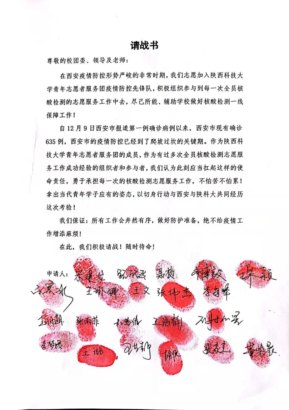 “我們志愿加入陜西科技大學(xué)青年志愿者服務(wù)團(tuán)疫情防控先鋒隊(duì),拿出當(dāng)代青年學(xué)子應(yīng)有的姿態(tài),以切身行動(dòng)與西安與陜科大共同經(jīng)歷這次考驗(yàn)!”這是我校青年志愿者服務(wù)團(tuán)遞交的“請(qǐng)戰(zhàn)書(shū)”。一張普通的信箋紙上,代表的簽名和手印格外耀眼,話語(yǔ)鏗鏘有力,情緒激昂堅(jiān)定,以最質(zhì)樸的方式傳達(dá)出抗擊疫情的熱情和決心。