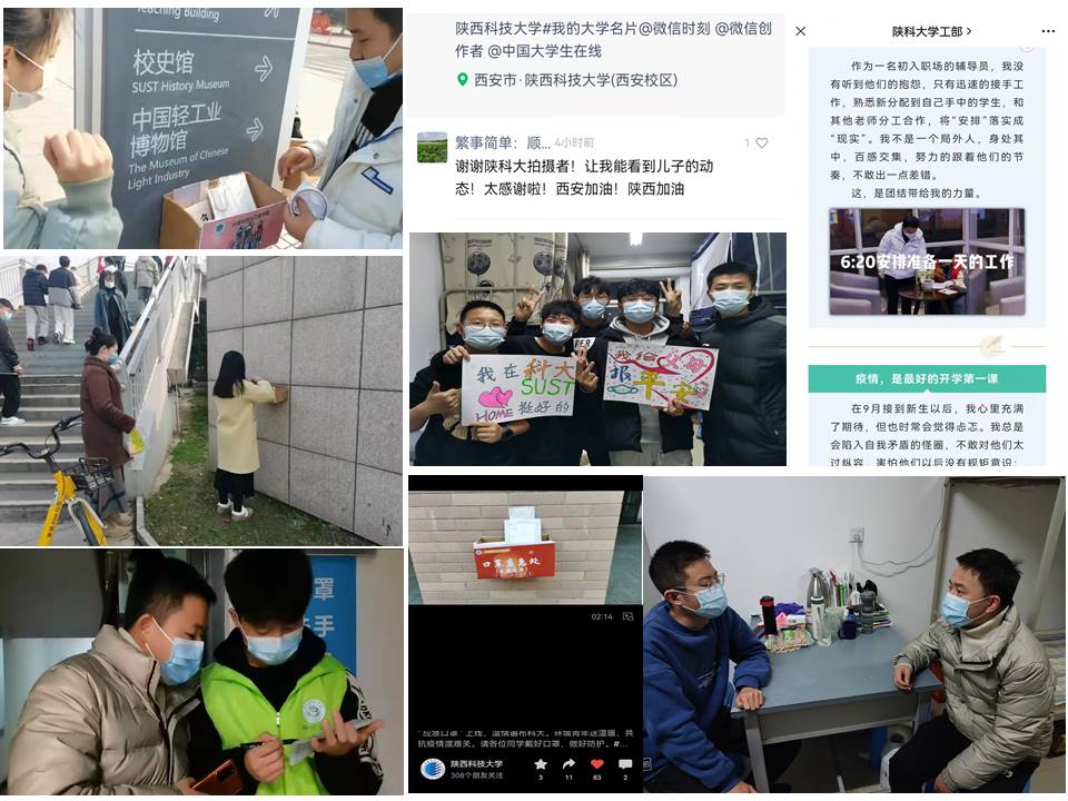 入職半年的娃娃臉秦向濤始終堅(jiān)持在疫情防控第一線,他發(fā)起并組織實(shí)施的“應(yīng)急口罩”互助行動(dòng),在學(xué)校人流必經(jīng)之處設(shè)立18個(gè)放置點(diǎn),先后投放3000多個(gè)醫(yī)用口罩,受到學(xué)校師生的一致好評(píng),校園網(wǎng)以及“陜西科技大學(xué)”、“sust云科大”、“團(tuán)聚陜科大”等公眾號(hào)及視頻號(hào)先后給與關(guān)注;他制作的視頻《我向家長(zhǎng)報(bào)平安》,讓身在遠(yuǎn)方的家長(zhǎng)可以看到孩子在學(xué)校的生活狀態(tài),在“陜西科技大學(xué)”視頻號(hào)評(píng)論區(qū)有家長(zhǎng)留言說:“謝謝陜科大的拍攝者,讓我能看到兒子的動(dòng)態(tài),太感謝了!西安加油!陜西加油!”;他依托“SUST環(huán)境青年”設(shè)立的【環(huán)境 抗疫錄】專欄,充分發(fā)揮環(huán)境學(xué)院青年志愿者的榜樣力量,激發(fā)更多學(xué)生為疫情防控做出自己的貢獻(xiàn);他撰寫的網(wǎng)文《畢業(yè)7個(gè)月,工作183天,我想和你們分享的3句戰(zhàn)疫語錄》發(fā)表在“陜西科技大學(xué)學(xué)工部”公眾號(hào),通過講述自己在疫情防控中的工作和感悟,給學(xué)生上了一堂情感真摯的思政教育課。秦向濤說:“我希望通過自己的一點(diǎn)努力,將愛校教育、感恩教育、紀(jì)律教育等融入學(xué)生思想引領(lǐng)和生活關(guān)懷,幫助更多的學(xué)生成長(zhǎng)成才”。