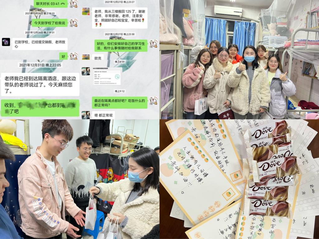 在西安疫情最吃緊的階段,為了保障她的125名考研學(xué)生能夠順利進(jìn)入考場(chǎng),懷有九個(gè)月身孕的“準(zhǔn)媽媽”劉紅,每天拖著笨重的身體四處奔走,一邊組織安排學(xué)生參加學(xué)校的核酸檢測(cè),一邊通過線上線下的方式與招生考點(diǎn)、學(xué)生家長(zhǎng)、學(xué)院領(lǐng)導(dǎo)等聯(lián)系溝通盡力解決學(xué)生面臨的困難,同時(shí)為了緩解考研學(xué)生的緊張情緒,她將親手制作考研加油包、親筆書寫明信片送到每一個(gè)學(xué)生手中,用愛心守護(hù)學(xué)生的考研夢(mèng)想。考研結(jié)束后,她第一時(shí)間電話聯(lián)系到每一位校外考點(diǎn)的學(xué)生,確認(rèn)已安全返校后一顆懸著的心才放下來,直到現(xiàn)在,每天電話聯(lián)系因外出考研被隔離的學(xué)生談?wù)勑?,關(guān)注學(xué)生每日體溫變化及核酸檢測(cè)等數(shù)據(jù),已經(jīng)成為她的工作日常。劉紅說:“學(xué)生的信任是我們工作最大的動(dòng)力,陪著學(xué)生成長(zhǎng)是我最大的幸福,只要你們需要,我一直都在”。