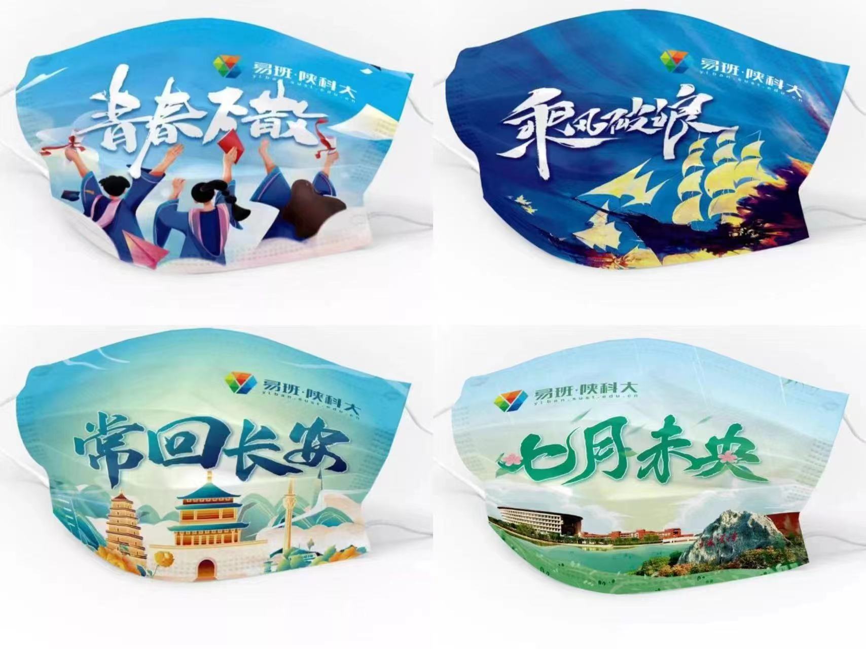 “守住健康、承載回憶、傳遞力量,以?罩之名,紀(jì)念那些共同抗疫的無悔青春?!币装喟l(fā)展中心為全體畢業(yè)生定制的“青春之歌”系列口罩以及“前程似錦”系列手袋深受畢業(yè)生喜愛。定制口罩包括“紀(jì)念青春”“鯤鵬展翅”“回首相聚”等六種款式,色彩絢麗,質(zhì)感極佳。定制手袋包括“常回長安”“絲路前行”兩種款式,通過國風(fēng)元素描繪千年古都與美麗科大的經(jīng)典建筑,同時融入鐵路、高層建筑等現(xiàn)代元素,古今呼應(yīng),和諧交融,寓意2022屆畢業(yè)生身處中國特色社會主義新時代,更需鑒古知今,與祖國共奮進(jìn),與時代共成長。