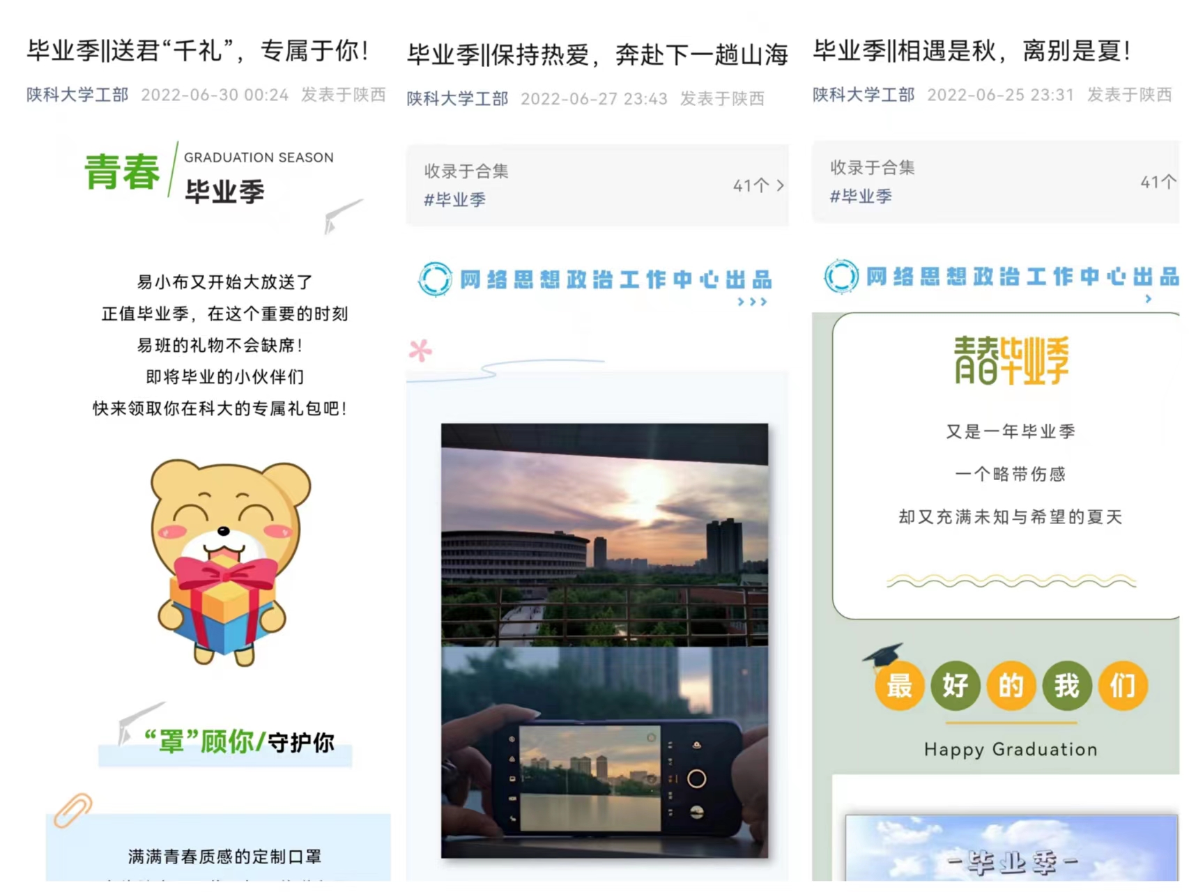 “乘風(fēng)破浪奔赴各地建功業(yè),歷盡千帆不忘初心仍少年”“意氣風(fēng)發(fā)披荊斬棘求真知,積以跬步縱橫天下繪宏圖”,6月24日,陜科大校園里掛上了數(shù)十條彩色橫幅,公寓樓前、餐廳門口,每位畢業(yè)生目之所及都是來自學(xué)校的深深祝福。同時,在網(wǎng)絡(luò)上,依托于微信訂閱號、視頻號等媒體矩陣推出的“畢業(yè)季”系列專欄也吸引了眾多師生的目光。11篇系列作品,萬余次點(diǎn)擊量,《相遇是秋,離別是夏》《送君“千禮”,專屬于你》《破繭窺光,躍入人?!贰侗3譄釔?,奔赴下一趟山?!贰龑?dǎo)畢業(yè)生在惜別友情、感恩母校的同時,以更加積極開放的心態(tài)面對未來。