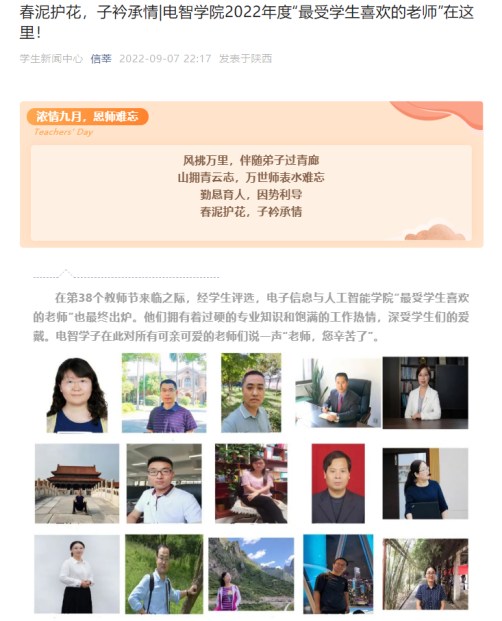 為進一步增強教師職業(yè)榮譽感、責(zé)任感和使命感,營造尊師重教的良好風(fēng)尚,團結(jié)凝聚廣大教師,在第38個教師節(jié)來臨之際,電子信息與人工智能學(xué)院開展慶祝教師節(jié)系列活動。
