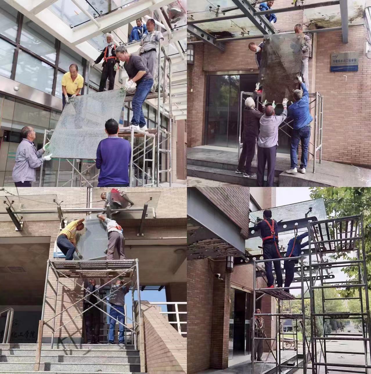 后勤集團工程維修中心在檢查各樓宇玻璃雨陽棚的過程中,發(fā)現(xiàn)人文樓、環(huán)境科學與工程學院樓、化學與化工學院門口、國際教育公寓樓等幾處雨陽棚玻璃存在安全隱患。由于使用時間較長,幾處雨陽棚玻璃出現(xiàn)了破裂的情況,如繼續(xù)使用,裂縫會越來越大、越來越多,最終可能出現(xiàn)玻璃整體破碎掉落、砸到路人的危險。工程維修中心將情況和解決方案及時上報,并根據(jù)上級審批意見組織開展更換雨陽棚玻璃的工作。