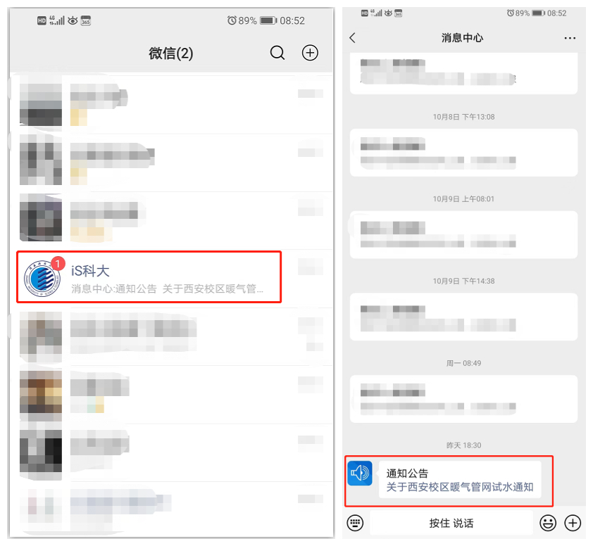 該功能由“iS科大”對(duì)接網(wǎng)站站群系統(tǒng)信息發(fā)布模塊,能夠?qū)崿F(xiàn)將校園網(wǎng)首頁(yè)“通知公告”欄目最新發(fā)布的與教職工學(xué)習(xí)生活密切相關(guān)的內(nèi)容同步到微信端“iS科大”,提醒教職工及時(shí)查看,從而提升工作效能。學(xué)校校園網(wǎng)首頁(yè)通知公告欄目發(fā)布的周知性信息,經(jīng)發(fā)布者選擇后,教職工在手機(jī)端“iS科大”中就會(huì)收到消息提醒,點(diǎn)擊標(biāo)題即可查看具體通知內(nèi)容。