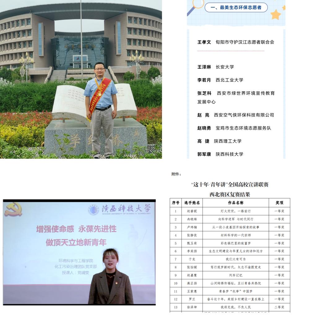 引領(lǐng)青年科技服務(wù)社會(huì)。近三年,榮獲國(guó)家級(jí)獎(jiǎng)勵(lì)10余項(xiàng)、省級(jí)獎(jiǎng)勵(lì)30余項(xiàng)。榮獲“挑戰(zhàn)杯”國(guó)賽三等獎(jiǎng)1項(xiàng),省級(jí)特等獎(jiǎng)、省級(jí)銀獎(jiǎng)各1項(xiàng);榮獲“互聯(lián)網(wǎng)+”大賽全國(guó)總決賽銅獎(jiǎng)1項(xiàng),省賽金獎(jiǎng)1項(xiàng)、銀獎(jiǎng)3項(xiàng);以及節(jié)能減排大賽全國(guó)三等獎(jiǎng)5項(xiàng)、全國(guó)環(huán)境友好科技競(jìng)賽國(guó)賽三等獎(jiǎng)1項(xiàng)、入圍全國(guó)博士后創(chuàng)新創(chuàng)業(yè)大賽1項(xiàng)、全國(guó)大學(xué)生生命科學(xué)競(jìng)賽(創(chuàng)新創(chuàng)業(yè)類)三等獎(jiǎng)2項(xiàng)、陜西省科技創(chuàng)新創(chuàng)業(yè)大賽二等獎(jiǎng)1項(xiàng)、第六屆“創(chuàng)客中國(guó)”陜西省中小企業(yè)創(chuàng)新創(chuàng)業(yè)大賽一等獎(jiǎng)1項(xiàng)、西安國(guó)際創(chuàng)業(yè)大賽一等獎(jiǎng)1項(xiàng)、中國(guó)深圳創(chuàng)新創(chuàng)業(yè)大賽二等獎(jiǎng)1項(xiàng)?!瓣兾魇∽蠲狼嗄曛驹阜?wù)組織”三葉草青年志愿者服務(wù)團(tuán)環(huán)保志愿服務(wù)項(xiàng)目《“走進(jìn)自然,珍愛(ài)朱鹮”生態(tài)研學(xué)環(huán)保公益實(shí)踐》獲批“陜西省全面提升公民生態(tài)文明意識(shí)行動(dòng)計(jì)劃”公益資助項(xiàng)目,秦嶺生態(tài)環(huán)保“青年學(xué)者”張超、張蕾分別獲批2022年秦嶺生態(tài)科學(xué)考察項(xiàng)目。