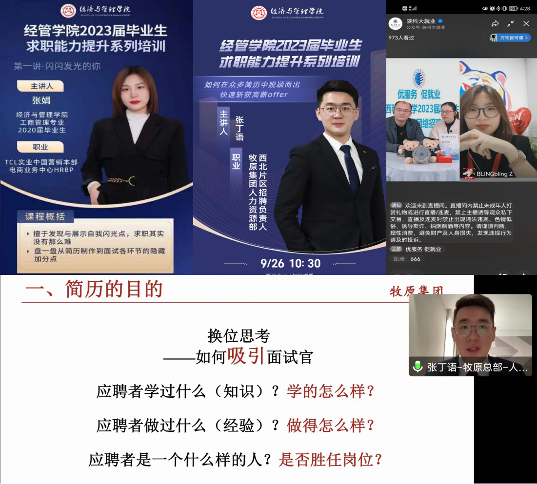 暖心式求職就業(yè)服務,抓好就業(yè)能力提升。為搶抓2023屆畢業(yè)生就業(yè)開局期,針對學生求職過程中存在的簡歷不會做、面試能力欠缺等現(xiàn)實問題。一開學,學院就組織開展三期線上求職能力培訓,邀請了TCL集團、牧原集團及上海漢得信息技術(shù)的人力資源經(jīng)理,分專題開展求職指導培訓,有效提升了學生的求職意愿和能力。同時,畢業(yè)班輔導員開展精準式求職指導,通過走訪宿舍、個體談話等方式,靶向施策,點對點指導簡歷修改,面對面講授面試技巧,隨時解答好學生求職中遇到的困難。