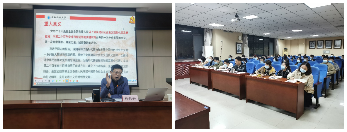 楊長安作題為“學(xué)習(xí)宣傳貫徹‘黨的二十大’精神——做有理想,敢擔(dān)當(dāng),能吃苦,肯奮斗的新時代好青年”的學(xué)習(xí)分享。一是領(lǐng)學(xué)報告,領(lǐng)會精神明方向。他全文領(lǐng)學(xué)了黨的二十大報告,對報告蘊(yùn)含的新觀點(diǎn)、新論斷、新思想、新戰(zhàn)略、新要求進(jìn)行了詳細(xì)梳理和解讀,并要求全體學(xué)生原原本本學(xué)習(xí)研讀黨的二十大報告和《中國共產(chǎn)黨章程》,認(rèn)真領(lǐng)悟黨的二十大提出的新思想新論斷、作出的新部署新要求。二是知所從來,圍繞核心跟黨走。他回顧了習(xí)近平總書記的青春歲月和成長歷程,闡明了習(xí)近平總書記成為全黨領(lǐng)導(dǎo)核心、人民領(lǐng)袖和軍隊統(tǒng)帥具有堅實的實踐基礎(chǔ)和深厚的群眾基礎(chǔ)。他提到,核心就是力量,旗幟就是方向,全力推動黨的二十大精神在學(xué)院各項工作中落地生根,最根本的就是擁護(hù)“兩個確立”,堅決做到“兩個維護(hù)”。三是堅定信念,爭做時代好青年。他講述了多個習(xí)近平總書記同青年交往的故事,帶領(lǐng)大家從“為青年學(xué)生指明奮斗的‘時間表’”到“青年‘立大志、明大德、成大才、擔(dān)大任’”,重溫習(xí)近平總書記對廣大青年學(xué)子的關(guān)心和鞭策,勉勵同學(xué)們要在最好的時代里堅定理想信念,立志成為有理想、敢擔(dān)當(dāng)、能吃苦、肯奮斗的新時代好青年。