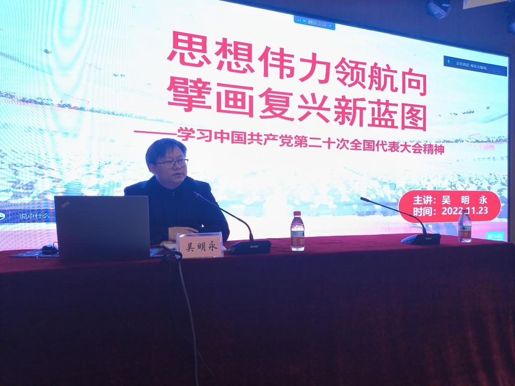 吳明永從“簡識黨的二十大-會議及報告要點解讀、奮進(jìn)新時代-過去五年的工作和新時代十年的偉大變革、理論新飛躍-開辟馬克思主義中國化時代化新境界、擘畫新藍(lán)圖-以中國式現(xiàn)代化全面推進(jìn)中華民族偉大復(fù)興、啟航新征程-為全面建設(shè)社會主義現(xiàn)代化國家而團(tuán)結(jié)奮斗”五個方面對黨的二十大精神進(jìn)行了系統(tǒng)宣講和闡釋。他號召大家要更加緊密地團(tuán)結(jié)在以習(xí)近平同志為核心的黨中央周圍,全面貫徹習(xí)近平新時代中國特色社會主義思想,牢記空談?wù)`國、實干興邦,堅定信心、同心同德,埋頭苦干、奮勇前進(jìn),為全面建設(shè)社會主義現(xiàn)代化國家、全面推進(jìn)中華民族偉大復(fù)興而團(tuán)結(jié)奮斗。