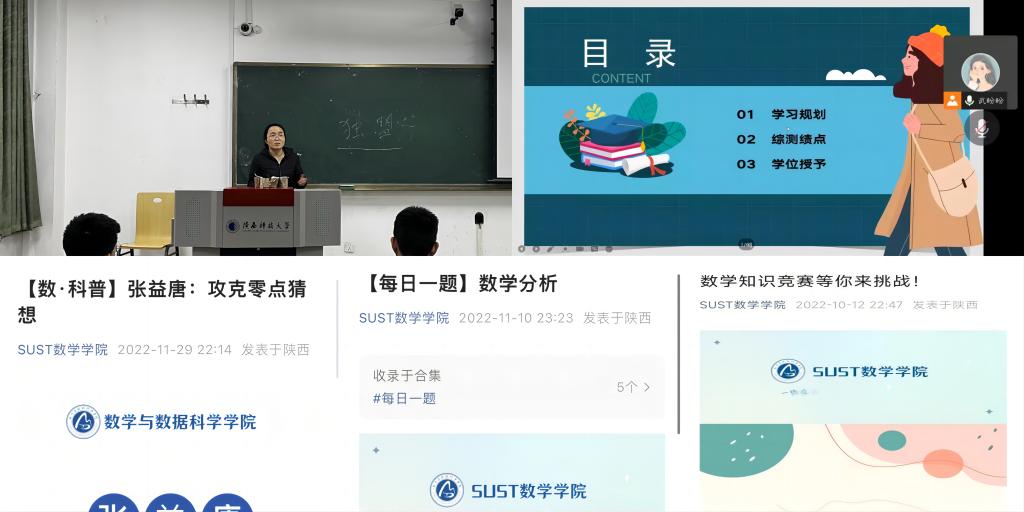 強(qiáng)化專(zhuān)業(yè)教育,描繪成長(zhǎng)成才“導(dǎo)航圖”。學(xué)院高度重視新生專(zhuān)業(yè)教育,幫助新生認(rèn)識(shí)所學(xué)專(zhuān)業(yè),培養(yǎng)專(zhuān)業(yè)興趣,增強(qiáng)專(zhuān)業(yè)認(rèn)同,引導(dǎo)學(xué)生邁入專(zhuān)業(yè)學(xué)習(xí)“快車(chē)道”。邀請(qǐng)專(zhuān)業(yè)教師、優(yōu)秀在校生等召開(kāi)專(zhuān)業(yè)介紹會(huì)、班主任見(jiàn)面會(huì)、學(xué)習(xí)經(jīng)驗(yàn)分享交流會(huì),學(xué)院公眾號(hào)“SUST數(shù)學(xué)學(xué)院”開(kāi)通“數(shù)·科普”和“每日一題”專(zhuān)欄,舉辦“數(shù)學(xué)專(zhuān)業(yè)知識(shí)競(jìng)賽”等,全方位多角度促進(jìn)新生認(rèn)識(shí)所學(xué)專(zhuān)業(yè),培養(yǎng)專(zhuān)業(yè)思維,增進(jìn)專(zhuān)業(yè)認(rèn)同感,養(yǎng)成良好學(xué)習(xí)習(xí)慣,幫助新生畫(huà)好“專(zhuān)業(yè)規(guī)劃圖”。
