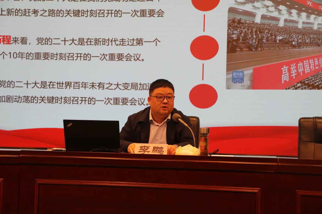 報告會上,李鵬以“深入學習貫徹黨的二十大精神”為主題,結合我校學生工作實際,從“黨的二十大召開的基本情況”“深入學習掌握黨的二十大報告中的理論重點”“學思踐悟、團結奮斗,為推進學生工作高質量發(fā)展貢獻力量”三個方面,對黨的二十大精神進行了全面、系統(tǒng)、深入的解讀輔導,重點就輔導員如何提升理論學習興趣、培養(yǎng)學習閱讀習慣、做好實踐育人等分享了個人經驗心得,對如何以黨的二十大精神指導學生工作更好開展提出了工作思路和實操舉措。報告在全體學生工作干部中引發(fā)熱烈反響。