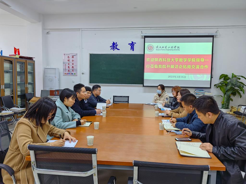 為深入推進“訪企拓崗”就業(yè)專項行動,千方百計助力畢業(yè)生高質(zhì)量就業(yè)。3月16日數(shù)學學院院長李劍帶隊,副院長白云霄、院長助理宋沛、相關輔導員及部分畢業(yè)班研究生一行赴陜西服裝工程學院教育學院開展“訪企拓崗”促就業(yè)活動。陜西服裝工程學院教育學院黨總支書記、執(zhí)行院長拓梅梅,副院長王偉,黨總支副書記王華東等參加了座談交流。
