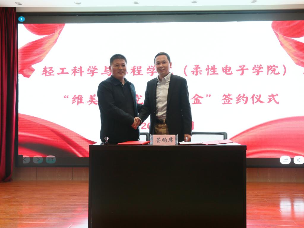 儀式上,張超和呂斌代表雙方共同簽署《陜西科技大學(xué)輕工科學(xué)與工程學(xué)院(柔性電子學(xué)院)“維美德研究生獎學(xué)金”合作協(xié)議書》,這是繼設(shè)立本科生獎學(xué)金、開設(shè)培訓(xùn)課程、搭建實踐教學(xué)和實習(xí)就業(yè)基地等合作后的又一重要舉措。