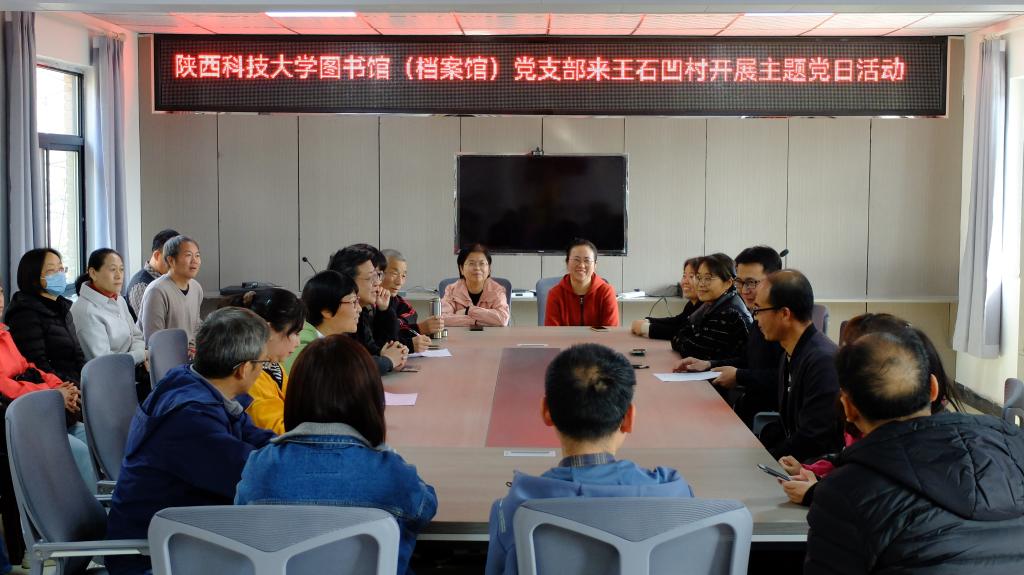 在王石凹村委會(huì),第一書記姜興健首先分享了我校幫扶王石凹村脫貧攻堅(jiān)的歷程,講述了通過七年的努力如何將一個(gè)因老因殘因病致貧的嚴(yán)重貧困村蛻變成一個(gè)經(jīng)濟(jì)產(chǎn)業(yè)特色村的全過程和先進(jìn)經(jīng)驗(yàn)。圖書館(檔案館)支部書記鄭勇介紹了支部的總體情況和此次活動(dòng)的目的意義,副書記趙小羽從支部的五個(gè)團(tuán)隊(duì)建設(shè)、制度規(guī)范優(yōu)化、組織生活方式創(chuàng)新、疫情服務(wù)等方面介紹黨建工作與中心工作同步進(jìn)行的經(jīng)驗(yàn)和亮點(diǎn),根據(jù)王石凹村黨員難集中,組織生活開展形式不豐富的問題,提出圖書館可發(fā)揮資源優(yōu)勢,通過線上VR方式開展紅色黨建工作的建議。王海剛從圖書檔案角度出發(fā),提出重點(diǎn)應(yīng)利用圖書館(檔案館)優(yōu)勢,從農(nóng)家書屋著手在精神文化層面推進(jìn)幫扶成效。