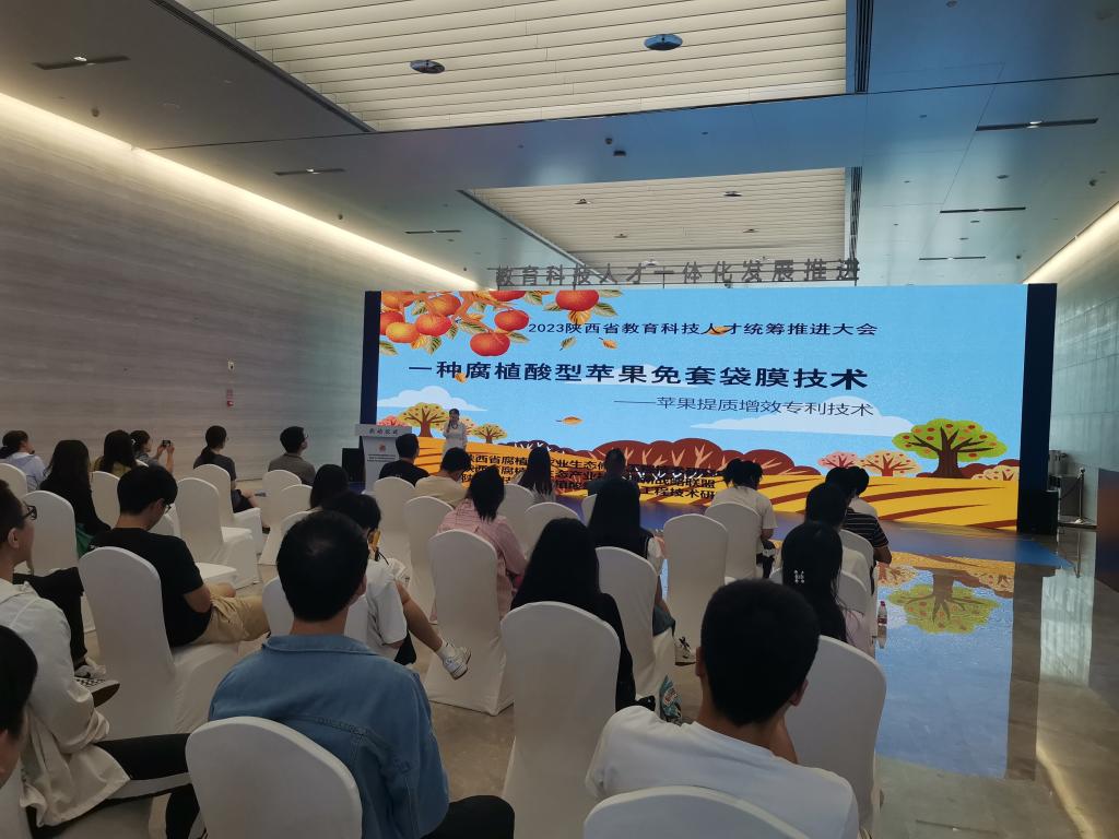 路演環(huán)節(jié),我校宋潔副教授就“一種腐殖酸型蘋果免套袋膜技術(shù)”進(jìn)行路演發(fā)布。多家企業(yè)和投資人對(duì)該技術(shù)表現(xiàn)出濃厚興趣并進(jìn)行了詳細(xì)的咨詢和交流。陜西高??萍汲晒构参齺?lái)自政界、學(xué)界、商界400余名代表齊聚一堂,共商教育、科技、人才融合發(fā)展。