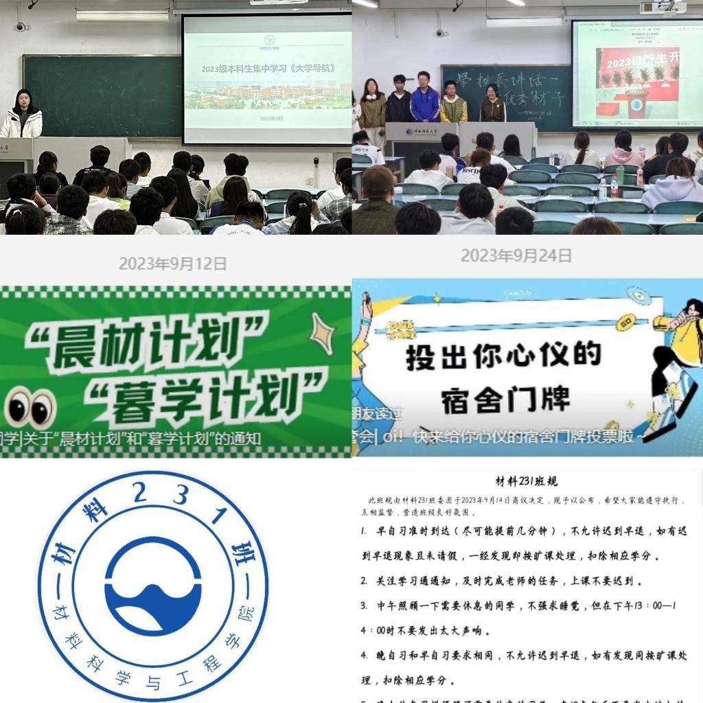 聚焦規(guī)矩意識(shí) 強(qiáng)化日常管理。通過(guò)新生入學(xué)教育大會(huì),集中學(xué)習(xí)《校長(zhǎng)李志健在2023級(jí)新生開(kāi)學(xué)典禮暨軍訓(xùn)動(dòng)員大會(huì)上的講話》《大學(xué)導(dǎo)航》《陜西科技大學(xué)章程》等教育內(nèi)容,幫助新生明確學(xué)校規(guī)章制度,培養(yǎng)新生規(guī)矩意識(shí);2023級(jí)新生自進(jìn)入正常教學(xué)周起,全員參與材料學(xué)院晨材計(jì)劃、暮學(xué)計(jì)劃,豐富校園生活,保持學(xué)習(xí)熱情,營(yíng)造了良好的學(xué)習(xí)氛圍和優(yōu)良學(xué)風(fēng);各班依照《大學(xué)導(dǎo)航》制定《班級(jí)規(guī)定》及班級(jí)標(biāo)識(shí)體系,將個(gè)人行為與集體榮譽(yù)密切集合,建立向上向好向?qū)W班風(fēng);學(xué)院自管會(huì)開(kāi)展宿舍門(mén)牌設(shè)計(jì)大賽,創(chuàng)造文明寢室環(huán)境,創(chuàng)建和諧宿舍舍風(fēng);同時(shí)針對(duì)日常管理、學(xué)籍管理、活動(dòng)參與等開(kāi)展專項(xiàng)教育,引導(dǎo)學(xué)生強(qiáng)化主體意識(shí),激發(fā)自律自省。