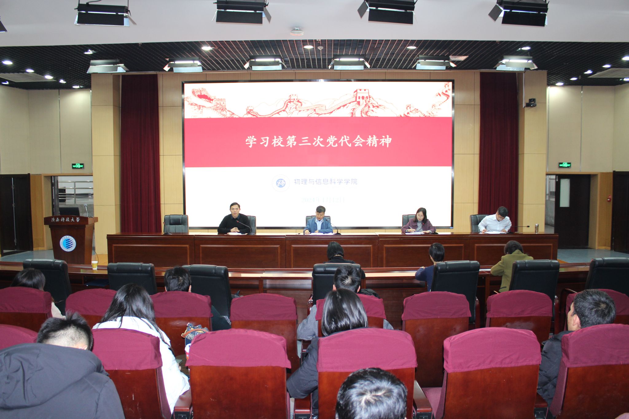 為了深入學(xué)習(xí)貫徹學(xué)校第三次黨代會精神,1月12日下午,物理與信息科學(xué)學(xué)院在圖書館報告廳召開全體教職工會議,傳達學(xué)習(xí)學(xué)校第三次黨代會精神。會議由學(xué)院黨委書記陳源梅主持,全體教職工參加學(xué)習(xí)。