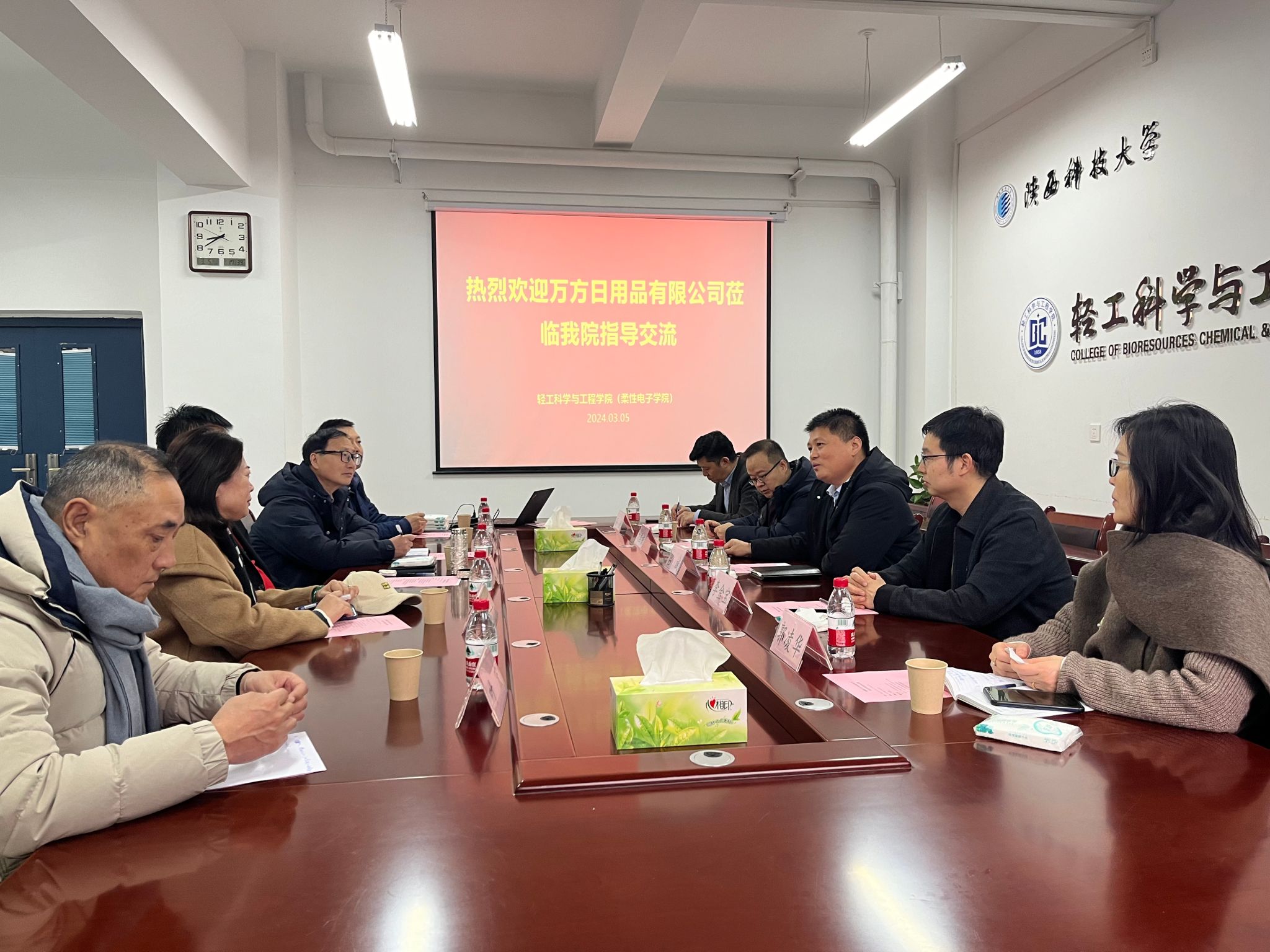 輕工學(xué)院院長呂斌對旌德縣萬方日用品有限公司一行的到訪表示熱烈歡迎,并介紹了陜西科技大學(xué)與輕工學(xué)院的發(fā)展歷程,以及近年來學(xué)院在學(xué)科建設(shè)、人才培養(yǎng)、科學(xué)研究等方面取得的成果。輕工學(xué)院李金寶教授重點(diǎn)介紹了在紙紗、烘焙紙、微晶纖維素等方面的研究和產(chǎn)業(yè)化應(yīng)用等工作,校企雙方進(jìn)行了充分的交流和討論。