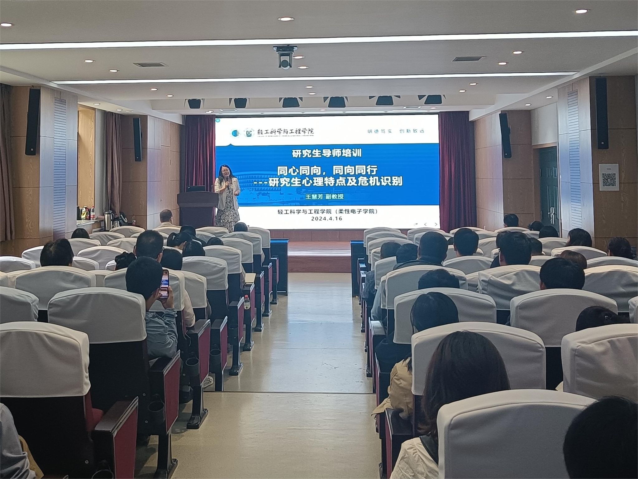 為提升學院研究生導師識別學生心理狀況、關(guān)注學生身心健康方面的工作能力,加強研究生導師心理健康教育水平,建設更加和諧的導學關(guān)系,4月16日下午,輕工科學與工程學院(柔性電子學院)于學院學術(shù)報告廳舉辦主題為“同心同享,同向同行——研究生心理特點及危機識別”的研究生導師心理健康教育專題培訓會。本次培訓由校心理健康教育中心副教授王慧芳主講,全體研究生導師和研究生輔導員參加學習。培訓會由輕工學院副院長劉國棟主持。