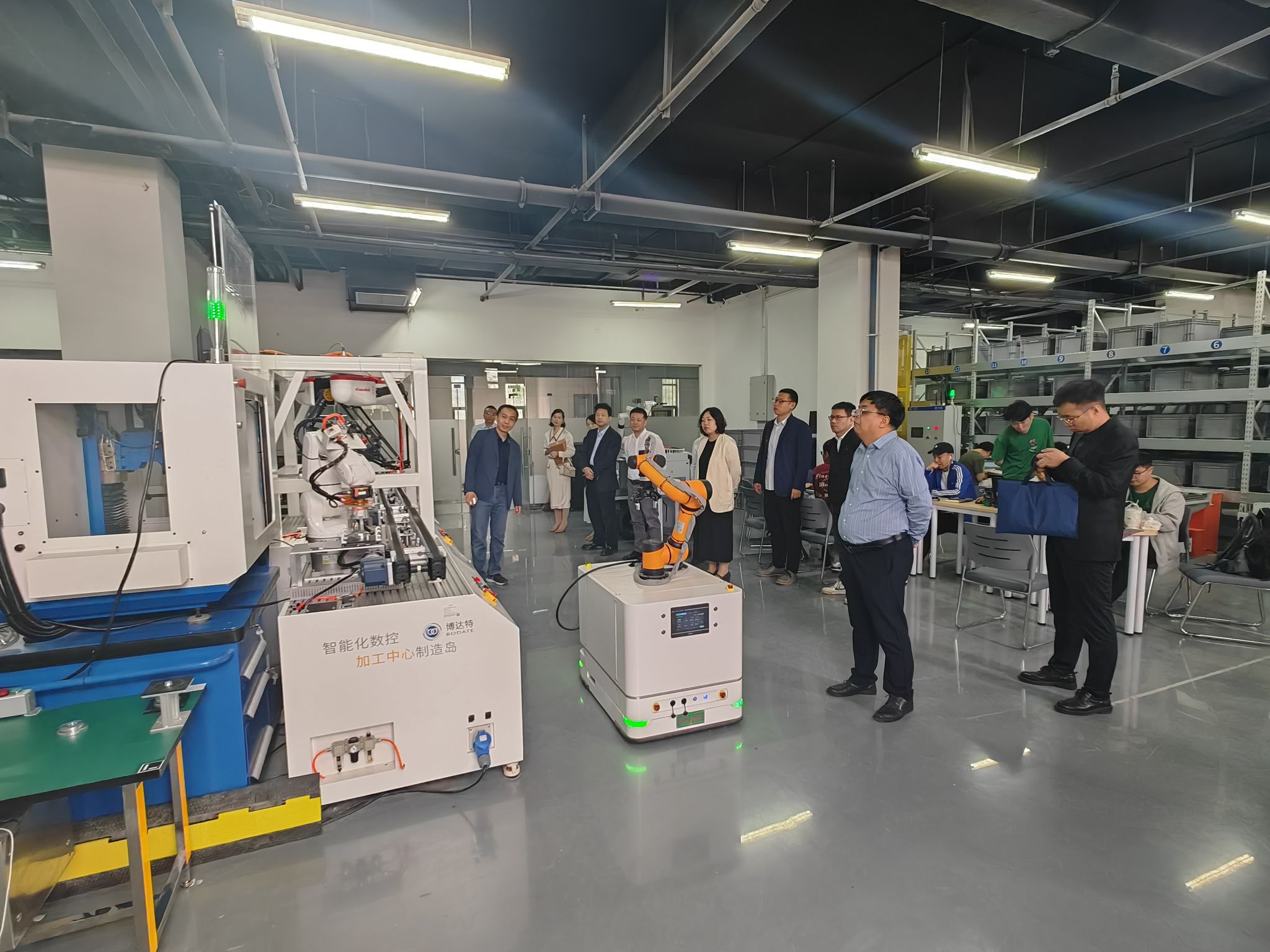 在中瑞GF智能制造創(chuàng)新研究院,考察了智能制造生產(chǎn)線、正在調試中的五軸加工中心、導軌機器人,以及智能倉儲穿梭車系統(tǒng)。在智能制造柔性生產(chǎn)線中,具有語音功能的AGV小車自動對各加工工位進行導覽和講解,MES系統(tǒng)大屏幕能夠自動顯示產(chǎn)線運行狀態(tài)和生產(chǎn)信息,產(chǎn)線中的機器人、傳送帶、加工單元有條不紊的工作,展示了現(xiàn)代制造生產(chǎn)線的運行狀況。在加工制造區(qū)域,MES系統(tǒng)顯示屏幕顯示兩臺加工中心的加工信息,地軌機器人能夠將原材料放入一臺加工中心加工,并將粗加工的產(chǎn)品取出,放入另一臺加工中心進行精密加工,加工完畢后,將產(chǎn)品取出放入倉位。張琳對機電學院在智能制造、柔性生產(chǎn)線方面的研發(fā)條件、實驗環(huán)境表示贊賞,希望學院能夠利用好這些科研條件,與浐灞國際港達成深度合作。趙江民就柔性生產(chǎn)線、穿梭車技術與參加培訓的教師、研究生進行了交流。