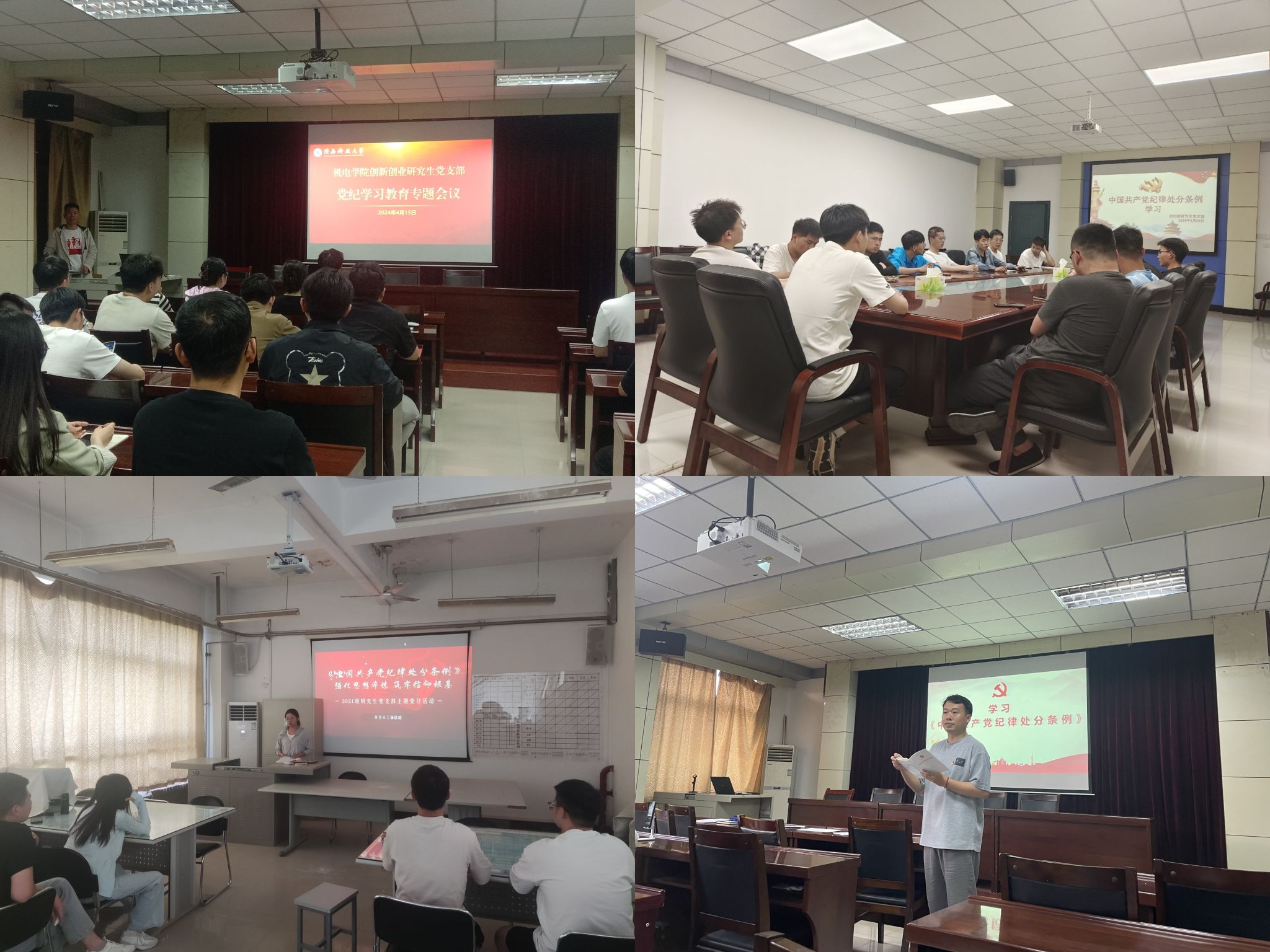 研究生黨支部通過支部書記講黨課、主題黨日活動、集中學習等形式進行黨風黨紀專題學習。博士黨支部組織觀看學習《教育系統(tǒng)違紀違法典型案例警示錄》,創(chuàng)新創(chuàng)業(yè)黨支部專題研討習近平總書記關于加強黨的紀律教育的重要論述,2021級研究生黨支部集中學習習近平總書記重要文章《必須堅持人民至上》,2022級研究生黨支部逐一分享《中國共產(chǎn)黨紀律處分條例》學習心得,2023級研究生黨支部組織開展“黨紀我先知”支部大討論活動。通過理論學習,使研究生黨員真正從思想上筑起一道永不倒塌的拒腐防變的堅固防線。