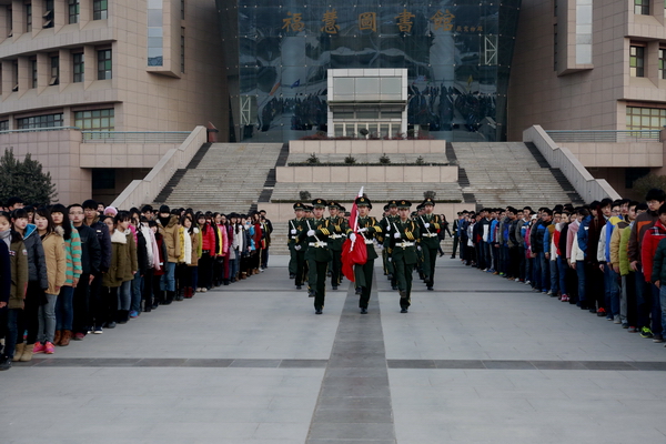清晨,雖然已是數(shù)九寒天,但圖書館南廣場上已經(jīng)聚集了數(shù)千名前來觀禮的師生。7點(diǎn)50分,校國旗護(hù)衛(wèi)隊(duì)的隊(duì)員們?cè)谧鲎詈蟮闹b整理,雖然已經(jīng)執(zhí)行過幾十次升旗儀式,但在這個(gè)特殊的日子,他們還是感到格外緊張。7點(diǎn)55分,50名身穿禮服的國旗護(hù)衛(wèi)隊(duì)員邁著矯健的步伐走向旗臺(tái)。8點(diǎn)整,伴隨著雄壯的國歌聲和一聲“敬禮”,國旗在半空中劃出了一道美麗的弧線。在場的每一個(gè)人臉上都露出了激動(dòng)的神情。