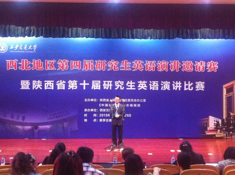 西北地區(qū)第四屆研究生英語(yǔ)演講邀請(qǐng)賽暨陜西省第十屆研究生英語(yǔ)演講比賽依托西北地區(qū)研究生教育平臺(tái)領(lǐng)導(dǎo)小組辦公室,由陜西省人民政府學(xué)位委員會(huì)辦公室和《中國(guó)研究生》編輯部主辦,西安交通大學(xué)和陜西省研究生外語(yǔ)教學(xué)研究會(huì)負(fù)責(zé)承辦。本屆比賽有來(lái)自西北五省及內(nèi)蒙古自治區(qū)69個(gè)研究生培養(yǎng)單位94名選手,按照指定題目演講、即席演講和現(xiàn)場(chǎng)問(wèn)答三個(gè)環(huán)節(jié)的展示,評(píng)選出一等獎(jiǎng)3名,二等獎(jiǎng)8名,三等獎(jiǎng)12名。