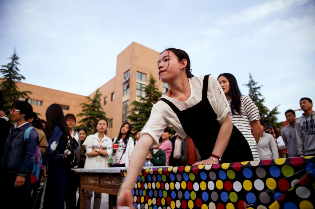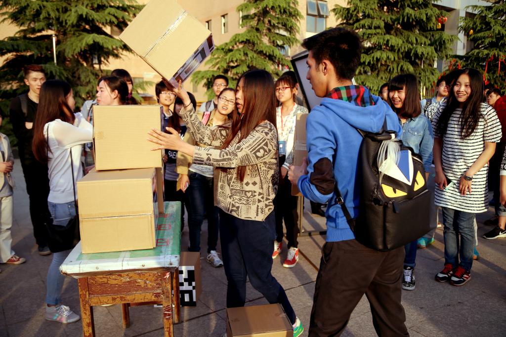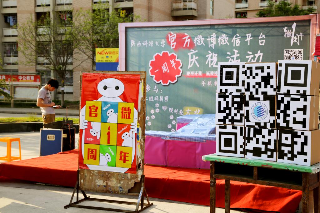 2015年4月21-23日,為了感謝大家的支持,拉近與小伙伴們的距離,官微在自己的一周歲生日會期間舉辦線上和線下活動,給一直以來默默支持的小伙伴們發(fā)福利!線下活動于4月21日下午6點在沁園廣場展開,通過二維碼拼圖、打沙包、限時搶大禮三個環(huán)節(jié)來贏取大禮。傍晚的廣場上比賽激烈、熱鬧非凡,加油聲、掌聲、笑聲、喝彩聲不絕于耳,令人記憶深刻的是官微“寶箱”中不僅有洗衣粉、香皂、插線板等日用品,還有陜科大老校區(qū)的明信片、印有官微二維碼的雨傘、獨家定制的陜西話小課堂CD等?;顒訒r間正逢學生下課,來往同學紛紛加入到比賽的當中。小伙伴紛紛感嘆“活動真給力,搶到的都是你的”。