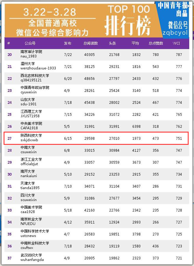 官微的社會影響力在不斷擴大,繼去年《我們的十年丨老校區(qū)的時光相冊》以高達19102次的閱讀量位列全國第四之后,《有一個科大只有我們知道》以高達17707次的閱讀量位列全國第二十三。同時,在中國青年報統(tǒng)計并發(fā)布“3.22-3.28日 top100全國高校微信公眾號綜合能力排行榜”中,我校以27010次閱讀總數(shù)、751分的微信傳播綜合指數(shù)(WCI)位居全國第二十七位。