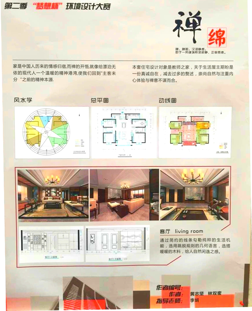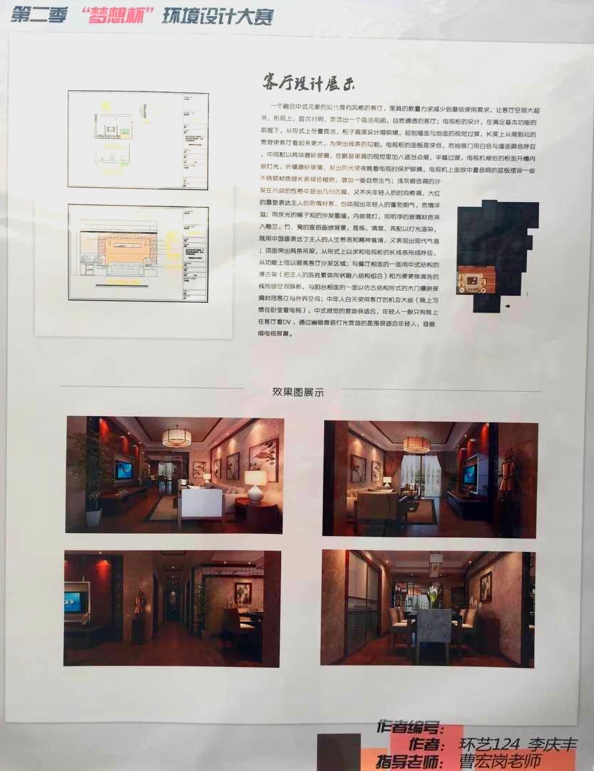 本次大賽由校工會、校團委、設(shè)藝學(xué)院主辦,旨在為陜科大第二期教職工住宅戶主提供裝修方案,以功能性和人性化為設(shè)計重點,同時兼顧滿足教職工對室內(nèi)裝潢的審美需求,著力體現(xiàn)科大學(xué)生的主人翁精神和設(shè)計素養(yǎng)。自去年年底大賽啟動以來,共計布展120幅裝修方案,展出70余天,已被教職工采納的方案14套,獲獎方案17套。一等獎代表作品二等獎代表作品 經(jīng)過專業(yè)評審組的合議,設(shè)藝學(xué)院環(huán)藝專業(yè)2011級黃志堅、林雙蜜組合的180平米現(xiàn)代中式風(fēng)格裝修方案憑借極具震撼的視覺效果、實用時尚的設(shè)計思路、飽含傳統(tǒng)元素的設(shè)計理念獲得總冠軍,最終捧得“夢想杯”;2012級學(xué)生楊惠的100平米簡約現(xiàn)代風(fēng)格、李慶豐的140平米現(xiàn)代中式風(fēng)格、周斯昊的180平米現(xiàn)代中式風(fēng)格獲得亞軍;符益東的100平米北歐風(fēng)格、雍錦軒的120平米現(xiàn)代簡約風(fēng)格、孫鈺瑩的140平米簡約田園混搭裝修方案獲得季軍。張越等十名學(xué)生獲得了優(yōu)秀獎。 作為設(shè)藝學(xué)院“畫筆點綴青春,設(shè)計服務(wù)校園“的系列品牌活動之一,第二屆“夢想杯”為陜科大教職工提供了符合居住需求的設(shè)計方案亦鍛煉了同學(xué)們的專業(yè)能力,起到了促進學(xué)風(fēng)、提振士氣的作用,也符合學(xué)院結(jié)合專業(yè)開展校園文化活動,解決實際問題的工作思路。頒獎現(xiàn)場環(huán)藝教研室?guī)熒硎荆骸皦粝氡弊尭嗤瑢W(xué)感受到了環(huán)藝設(shè)計的獨特以及艱辛,每個精美的方案都來之不易。設(shè)藝學(xué)院執(zhí)行院長詹秦川在總結(jié)中客觀地對本屆夢想杯做出了點評,指出此次活動的設(shè)計水準(zhǔn)距離高標(biāo)準(zhǔn)還有一定差距,設(shè)計不僅要滿足一般市場的審美需求,更要盡力得到專業(yè)人士的認(rèn)可,教研室老師應(yīng)該進一步發(fā)揮校園活動第二課堂的功能,只有在實踐中教學(xué)方能提升育人的質(zhì)量。(責(zé)任編輯:杜楊 學(xué)生編輯:張寧)