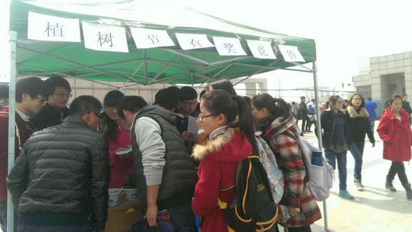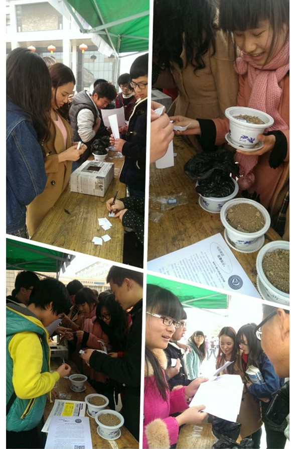 3月12日上午10點(diǎn),主題為“讓心愿和種子一起成長(zhǎng)”的植樹(shù)節(jié)有獎(jiǎng)競(jìng)猜活動(dòng)在沁園廣場(chǎng)上正式拉開(kāi)帷幕。活動(dòng)以現(xiàn)場(chǎng)答題的方式開(kāi)展,即參與者現(xiàn)場(chǎng)抽取三道有關(guān)植樹(shù)節(jié)相關(guān)知識(shí)的問(wèn)題,答對(duì)兩題就可獲花種和花盆。從上午十點(diǎn)持續(xù)到中午十二點(diǎn)四十,參與學(xué)生絡(luò)繹不絕,人人臉上都是一副期待與躍躍欲試的神情。不到三個(gè)小時(shí),1000多顆各色玫瑰和矮牽牛的花種及20多個(gè)小花盆很快被分發(fā)一空,我校學(xué)子對(duì)于環(huán)保的熱情和相關(guān)知識(shí)的了解可見(jiàn)一斑?;顒?dòng)結(jié)束后,電信學(xué)院青團(tuán)團(tuán)長(zhǎng)邵迪道出了該團(tuán)全體青年志愿者的期翼:“希望參與活動(dòng)的同學(xué)們都能在親手種下種子后,用對(duì)環(huán)保的熱情和對(duì)未來(lái)的希冀之意用心澆灌它們,并伴隨它們一起茁壯成長(zhǎng)?!?br />(責(zé)任編輯:杜楊)