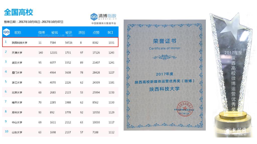 陜西科技大學(xué)黨委宣傳部于2014年先后開通官方微博、官方微信,并于2017年成立觀微工作室。截止2017年12月,我校官方微博粉絲已接近2萬人,累計發(fā)送微博5700余條。我校微博立足校園服務(wù)社會,利用自身網(wǎng)絡(luò)影響力向社會各界傳遞正能量,在信息傳播、引導(dǎo)涉校輿論、輿情應(yīng)對、網(wǎng)絡(luò)文化建設(shè)等方面發(fā)揮重要作用。在全國800多所高校微博影響力排行榜“周榜”中多次位列前茅,最高影響力排名全國第一名。