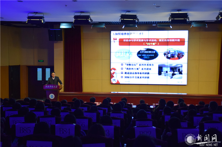 講座中,馬建中從“互聯(lián)網(wǎng)+”大學生創(chuàng)新創(chuàng)業(yè)大賽談起,通過“創(chuàng)新興趣、創(chuàng)新意識、創(chuàng)新思維、創(chuàng)新方法、創(chuàng)新實踐、創(chuàng)新成果”六個方面闡述了對培養(yǎng)創(chuàng)新型人才的理解。他結(jié)合自身從求學、深造到帶領(lǐng)團隊勇攀科研高峰,取得一項又一項可觀的學術(shù)成果,輸出一批又一批科研人才的鮮活案例,向到場的師生講述了他對如何培養(yǎng)創(chuàng)新思維和提升創(chuàng)新能力的獨到見解。突出強調(diào)了在校大學生要從主動培養(yǎng)創(chuàng)新興趣入手,積極參與學術(shù)競賽和科研實踐活動。馬建中談到一個有志于成為創(chuàng)新人才的年輕人,只有在成長之路上堅持“有心、留心、用心、細心、恒心和信心”才能成就一個青年大學生的科研之路。