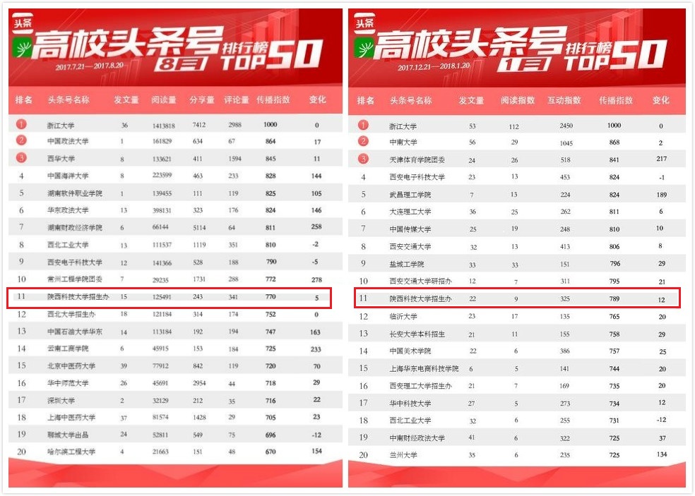 2017年8月和2018年1月排名全國高校頭條號榜單第11位,居同類型賬號冠軍