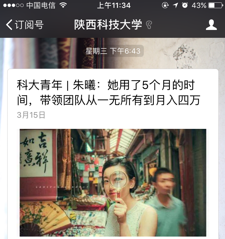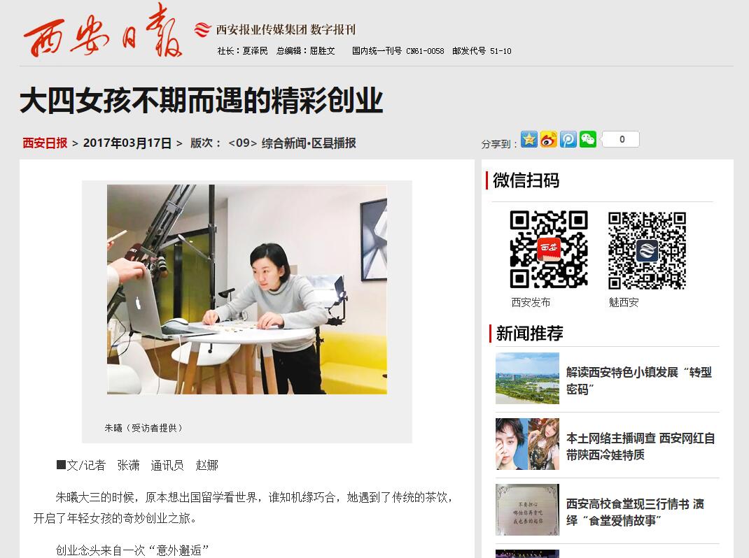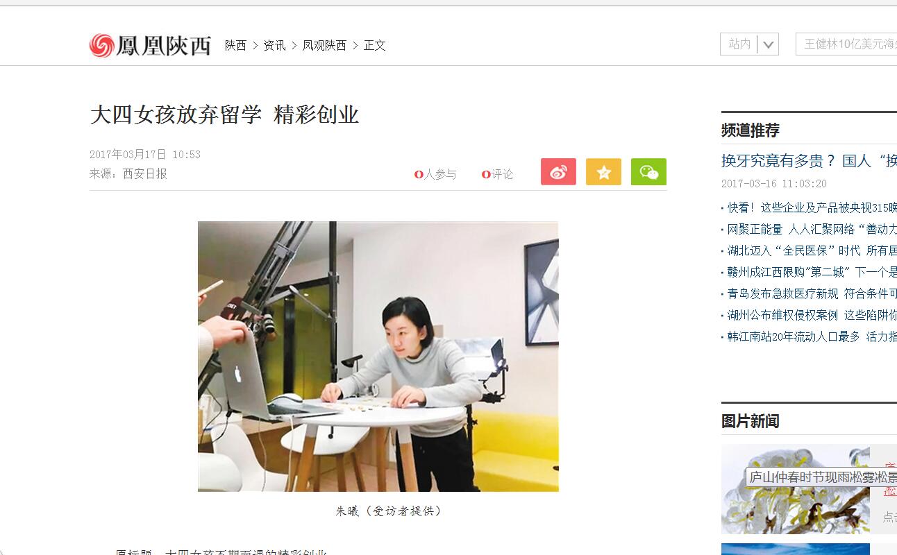 3月15日,一篇《科大青年 | 朱曦:她用了5個(gè)月的時(shí)間,帶領(lǐng)團(tuán)隊(duì)從一無(wú)所有到月入四萬(wàn)》的深度報(bào)道在我校官微發(fā)出后,迅速引起了眾多媒體的關(guān)注。朱曦,這位我校大四女孩的精彩創(chuàng)業(yè)故事先后被西安日?qǐng)?bào)、網(wǎng)易、鳳凰網(wǎng)等報(bào)道或轉(zhuǎn)載,陜西省教育廳微博也推送了一條關(guān)于朱曦創(chuàng)業(yè)團(tuán)隊(duì)的“從0開(kāi)始,向1邁進(jìn)”的微博。