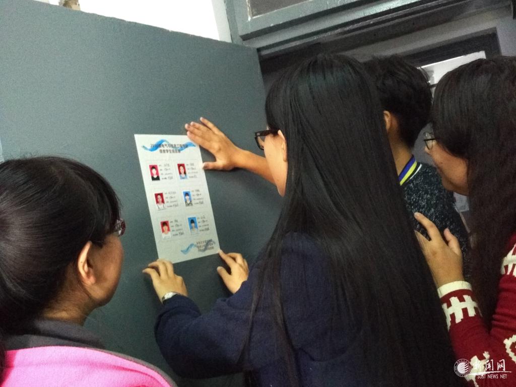 任歡老師(中)和學(xué)生一起張貼宿舍標(biāo)識(shí)