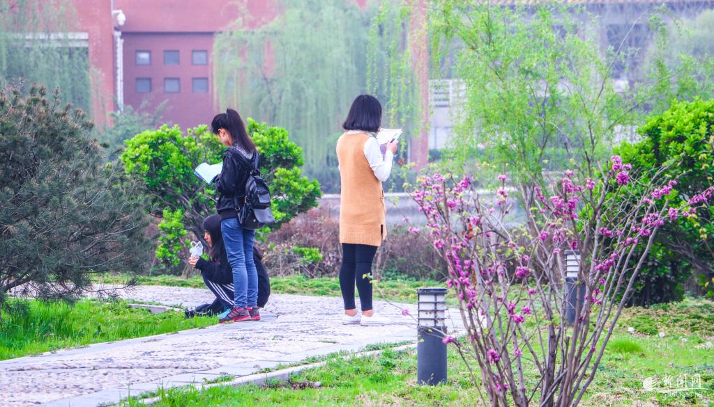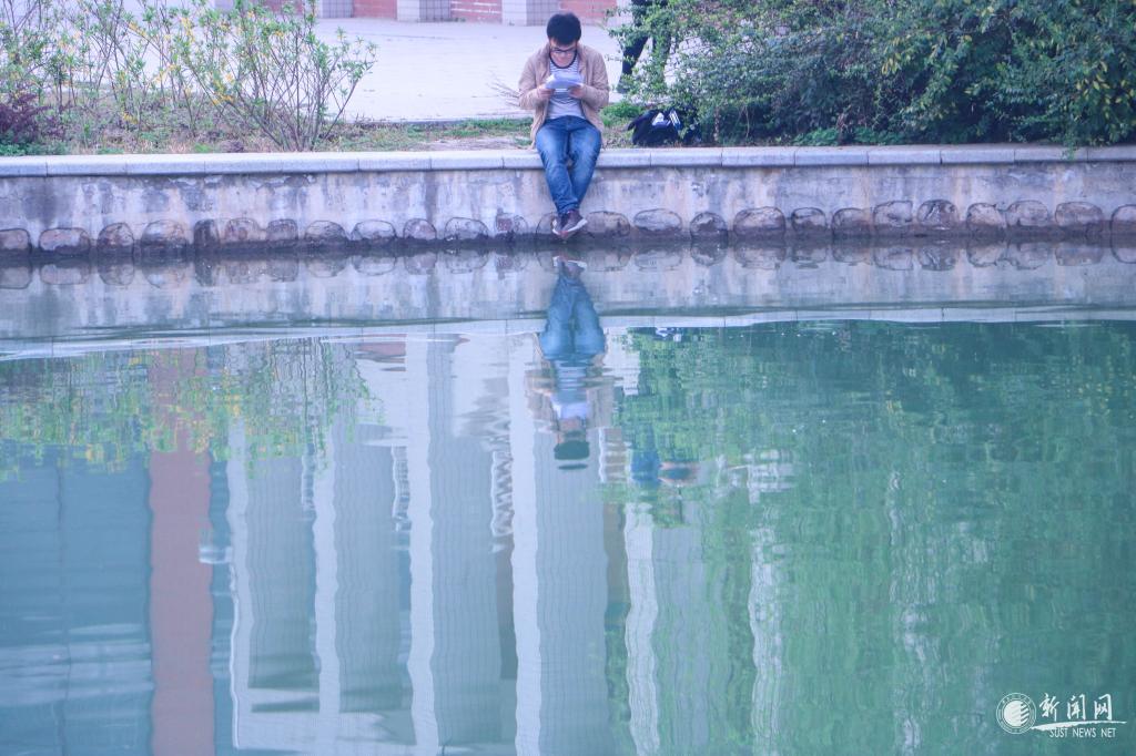 湖邊的人分為兩撥。在湖靠近化工樓一邊,排成排對著湖發(fā)出唱歌似的音調(diào)漸升悠遠綿長的“啊啊啊”聲的,是來自文傳學(xué)院播音專業(yè)的同學(xué),練習(xí)發(fā)聲是她們每天的必修課。剩下的拿著書本或站或坐地分散在湖邊的便是來參加晨讀的了。