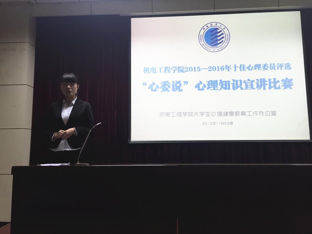 同時(shí)根據(jù)不同年級(jí)學(xué)生心理特點(diǎn)分別開展了各種心委行動(dòng)。11月23日晚,2014級(jí)心理委員為同學(xué)們獻(xiàn)上了一場激情飽滿的心委演說,既有“心理委員工作感悟”的心路歷程分享,又有“大學(xué)中的迷?!钡闹睋粜撵`的發(fā)問,還有“調(diào)整心態(tài),積極面對大學(xué)生活”的朋輩號(hào)召;2015級(jí)心理委員根據(jù)前期調(diào)研、講解指導(dǎo)、策劃修改,在各班組織開展了心理主題班會(huì),并于12月13日晚進(jìn)行了心理主題班會(huì)匯報(bào)答辯評(píng)比,機(jī)電154班的《你在煩惱什么?》、機(jī)械155班的《時(shí)間都去哪兒了》等心理班會(huì)各具特色?;顒?dòng)最終,結(jié)合線上投票和線下活動(dòng)評(píng)選成績評(píng)選出了學(xué)院的“十佳心理委員”。