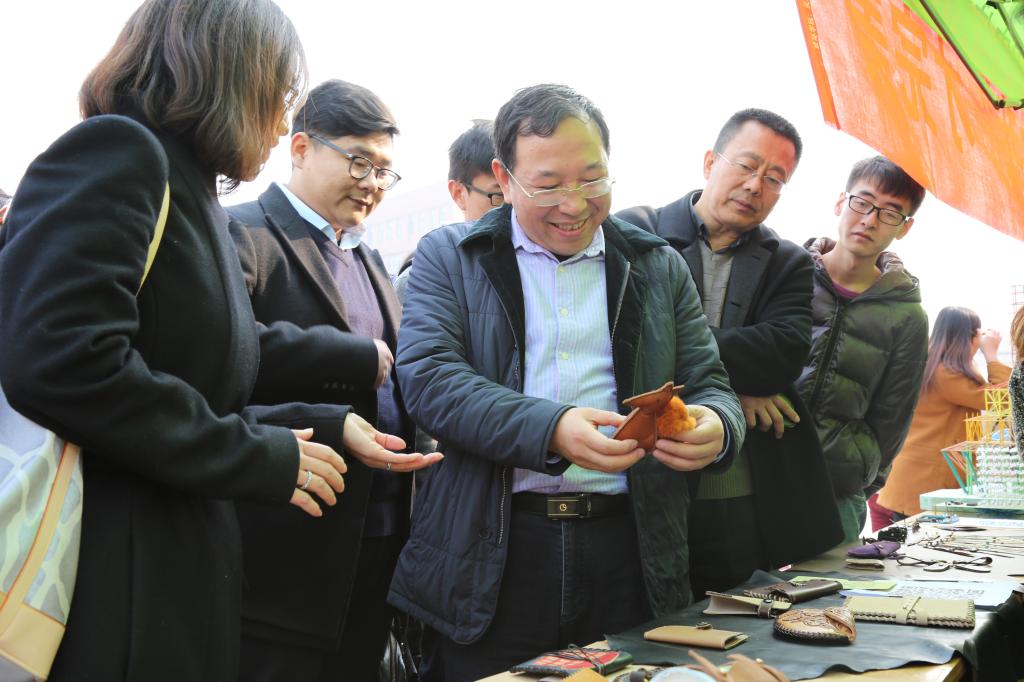 隔音型環(huán)保氣壓熱敷音樂眼罩、健身發(fā)電系統(tǒng)、紅棗打漿去核機、懶人克星時鐘、智能預警小車、空氣路由器……200余件科大學子的最新科技創(chuàng)新成果,12月7日齊刷刷亮相我校2015年大學生科技創(chuàng)新節(jié)暨大學生科技創(chuàng)新成果展開幕式。這些集體驗性、科學性、趣味性為一體的科技創(chuàng)新作品,吸引了萬余名師生駐足參觀,在全校掀起了大學生參與科技創(chuàng)新的又一熱潮。校長姚書志、校黨委副書記溫鋒親臨開幕式現(xiàn)場參觀指導。校長姚書志(左三)饒有興致地參觀了解科技創(chuàng)新作品的外觀、原理功能、實際應用等方面校黨委副書記溫鋒(左二)在利用變色反應原理的紙上題書“創(chuàng)新”兩字寄語莘莘科大學子