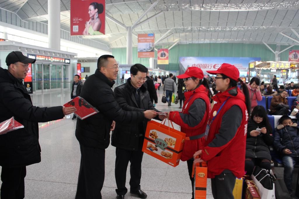 2月3日下午4時(shí),團(tuán)省委副書(shū)記單舒平、校黨委副書(shū)記溫鋒一行來(lái)到西安鐵路局西安北站,慰問(wèn)在這里參加春運(yùn)志愿服務(wù)的陜科大學(xué)子。自全國(guó)青年志愿服務(wù)春運(yùn)——“暖冬行動(dòng)”在西安北站啟動(dòng)起,我校共組織60名在校大學(xué)生參加此次春運(yùn)志愿服務(wù)。
