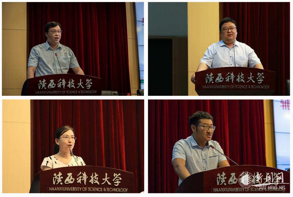 我校本屆備賽團隊代表李萌(左上)、李鵬(右上)及獲獎選手王雪婧(左下)、張欽峰(右下)分別發(fā)言