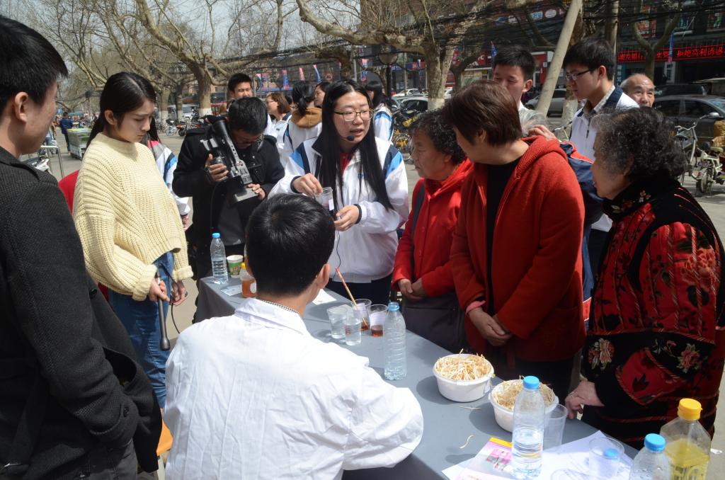 3月28日的徐家灣華潤(rùn)萬(wàn)家廣場(chǎng),來(lái)了一群特殊的客人,他們不像其他顧客一樣忙著選購(gòu)商品,而是穿起了實(shí)驗(yàn)用的白大褂,搬來(lái)了簡(jiǎn)易的實(shí)驗(yàn)臺(tái),用專(zhuān)業(yè)知識(shí)和科學(xué)實(shí)驗(yàn)向過(guò)往群眾傳授鑒別真假黑米、毒豆芽和正常豆芽、純蜂蜜和勾兌了糖水的蜂蜜、純香油和勾兌香油的檢測(cè)辦法,他們就是來(lái)自于我校食品與生物工程學(xué)院食品131團(tuán)支部的同學(xué)們,這項(xiàng)活動(dòng)就是他們此次學(xué)雷鋒志愿服務(wù)系列活動(dòng)的一部分。