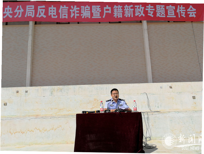 為使新生迅速適應(yīng)大學(xué)生活,提高安全意識(shí),結(jié)合軍訓(xùn)期間的安全教育、適應(yīng)教育安排,9月11日上午,學(xué)工部、保衛(wèi)處共同邀請(qǐng)公安局未央?yún)^(qū)分局部分警官,在田徑運(yùn)動(dòng)場(chǎng)舉辦了“公安未央分局反電信詐騙暨戶籍新政”專題宣傳會(huì)。2017級(jí)全體新生和輔導(dǎo)員參加了此次宣傳會(huì)。