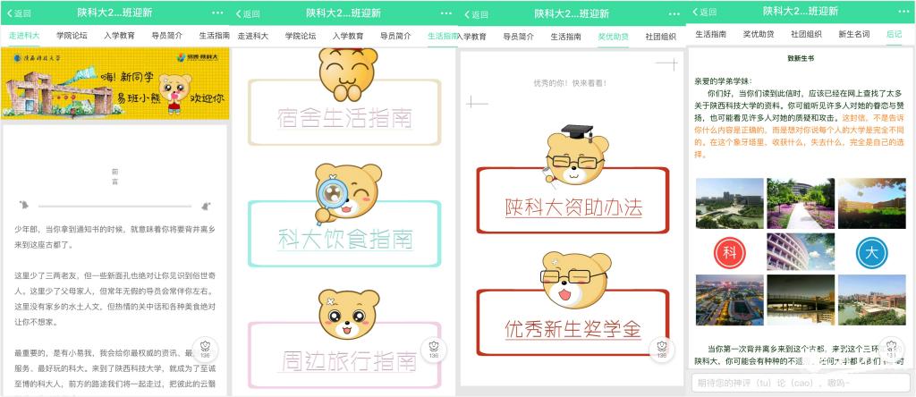 率先嘗試?yán)靡装嗥脚_(tái)將新生入學(xué)教育、管理和服務(wù)工作前置。7月29日,我校2017級(jí)易班迎新系統(tǒng)正式上線,系統(tǒng)涵蓋9大迎新專欄、7大入學(xué)教育主題、50余個(gè)校園生活功能頁(yè)面、100多張“畫冊(cè)”式校園圖示和3D全景空間校園展示、12個(gè)院(部)新生輔導(dǎo)員公共號(hào)等內(nèi)容,從食、住、行、學(xué)等方面對(duì)新生進(jìn)行了立體形象、圖文并茂的全方位宣傳推介和教育。易班迎新系統(tǒng)的上線既給新生營(yíng)造了美麗校園、美好大學(xué)時(shí)光的“初印象”,又徹底顛覆了新生來(lái)校報(bào)到、注冊(cè)繳費(fèi)后再聯(lián)系輔導(dǎo)員、熟悉校園環(huán)境的傳統(tǒng)迎新服務(wù)模式。系統(tǒng)開通僅三天, 2017級(jí)的3014名新生便已順利完成認(rèn)證報(bào)到,在共享全國(guó)各高校教育信息化成果的同時(shí),開始充分體驗(yàn)融生活服務(wù)、文化娛樂(lè)、教育教學(xué)、思想引領(lǐng)為一體的學(xué)校易班平臺(tái)的一站式服務(wù)。