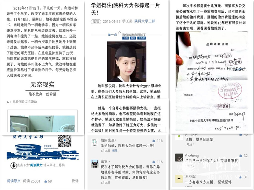 2015年11月15日,剛剛畢業(yè)不到半年的她在去往浦東圖書館還書的道路上發(fā)生車禍,經(jīng)過十余次手術(shù),欠下了近60萬的醫(yī)療費用,也給這個貧寒的家庭帶來了沉重的負擔。今年1月20日起,微博上一則#Lily想活下去#的話題引起的大家的關(guān)注,這是張俊莉本人在微博上公開向公眾求助。我校學工部也關(guān)注到了這條信息,通過聯(lián)系當事人,確認真實性后,經(jīng)申請批準,在我校易班和學工部官方微信平臺在1月25日發(fā)布了題為《學姐挺??!陜科大為你撐起一片天!》的文章,號召全體師生及校友為這個年輕的女孩募捐。短短24小時,文章閱讀量達22000人次,各方累計捐款達32萬元。在社會各界愛心人士的幫助下,在母校的持續(xù)關(guān)懷下,堅強的張俊莉勇敢面對人生的挫折,于今年9月份回到上海平安普惠上班,重新制定了自身的職業(yè)生涯規(guī)劃。