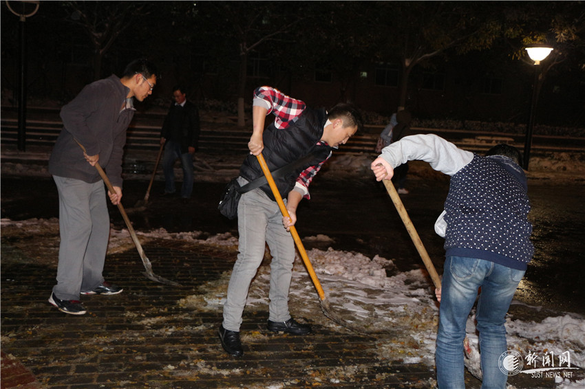 當(dāng)晚,號召一經(jīng)發(fā)出,學(xué)校陽光助學(xué)中心、國旗護衛(wèi)隊、公寓自管會、易班工作站紛紛響應(yīng),建立起愛心隊伍組織鏟雪行動,黨委副書記溫鋒也親臨現(xiàn)場參與鏟雪。冬日的雪夜寒風(fēng)刺骨,志愿者們的手都凍得通紅,但他們依然精神抖擻,不言辛苦,冒著嚴寒繼續(xù)鏟雪。他們的奉獻之心感染了路過的學(xué)生們,紛紛加入到了掃雪除冰的隊伍中。從黨員到群眾,從教師到學(xué)生,所有人的愛心匯聚成熾熱跳躍的火焰,點亮,溫暖了科大寒冷的夜。師生們齊心協(xié)力讓這個雪天不再“濕滑”,切實保障了師生們的出行,保障了學(xué)校各項教學(xué)科研工作的正常進行。他們的熱心構(gòu)成了這個雪天校園中最美的風(fēng)景。