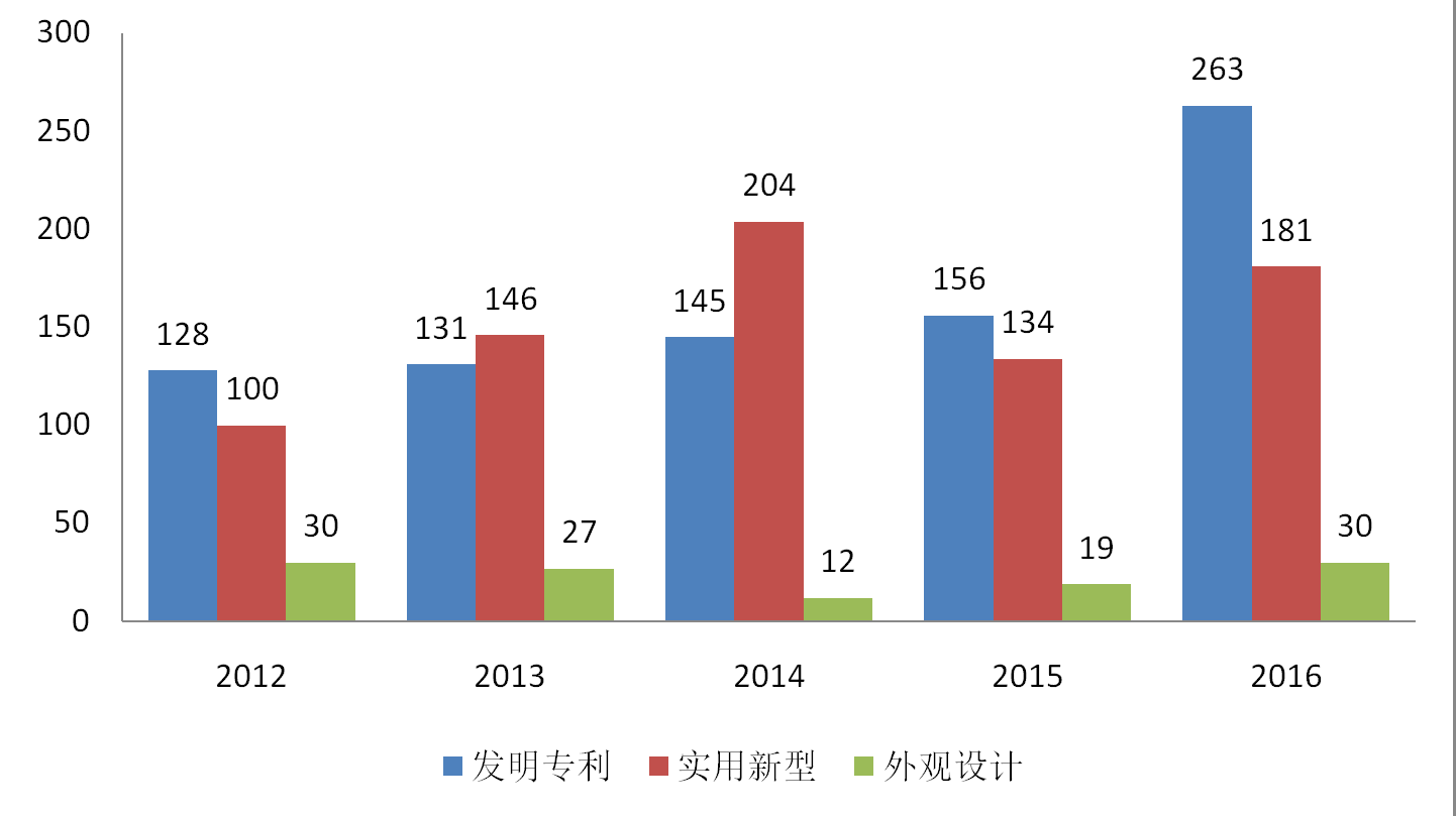 2012-2016年我校研究生中國專利授權(quán)統(tǒng)計圖