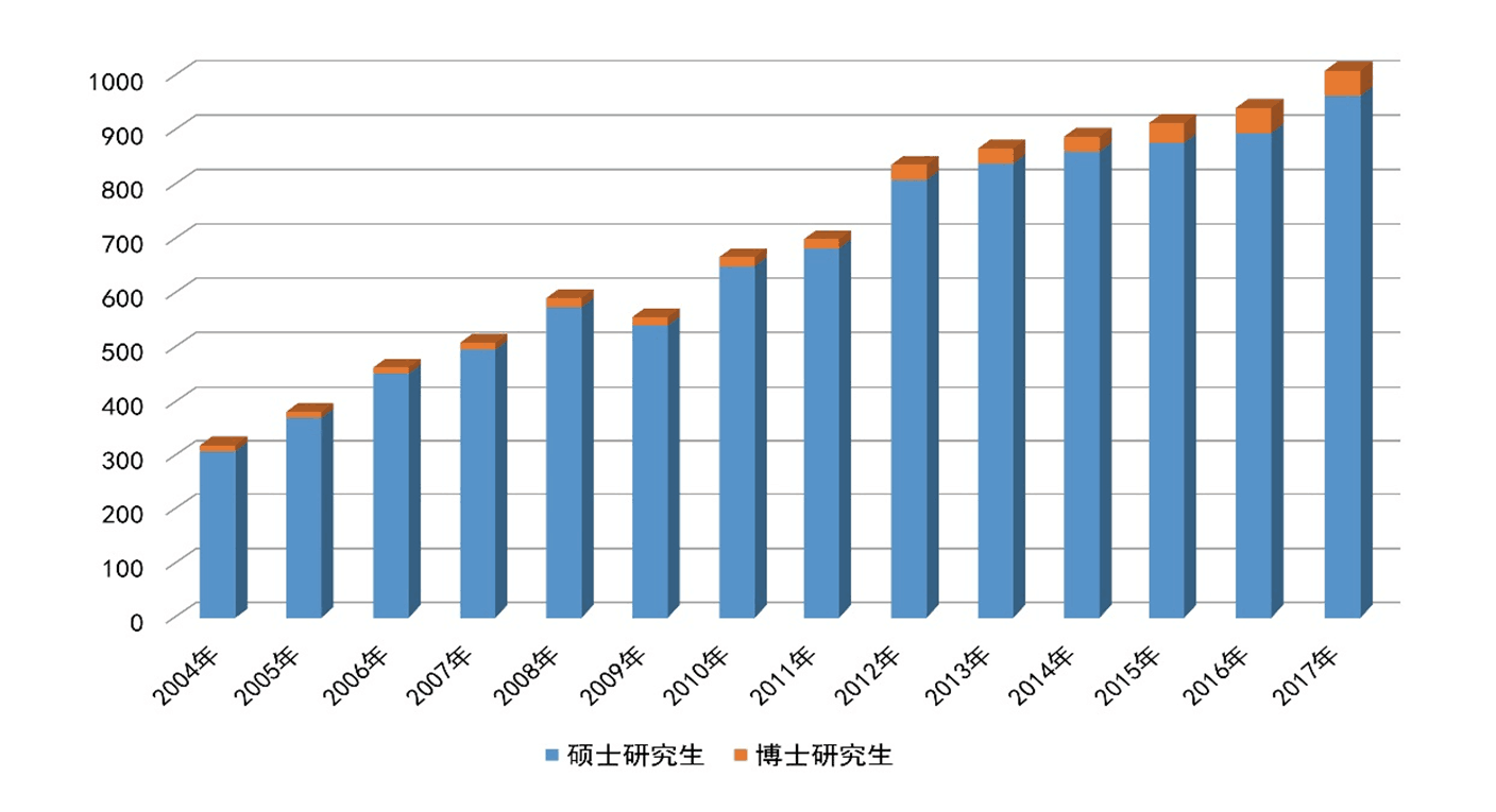 研究生招生規(guī)模不斷擴大,自2004年開始博士研究生招生以來,研究生招生數(shù)量增長超過三倍,2017年碩士研究生招生達到932人,博士研究生招生52人,目前各類在校全日制研究生2821名;同時,形成了“本碩博”一體化的創(chuàng)新型人才選拔機制,通過實施碩士研究生“優(yōu)秀生源計劃”、推免生“4+2”學制,博士研究生“碩博連讀”和“申請-考核”制,2017年推免生和碩士研究生本校生源率分別達到97.45%和53.04%,全日制非定向博士研究生比例連年增長,生源質(zhì)量顯著提高。