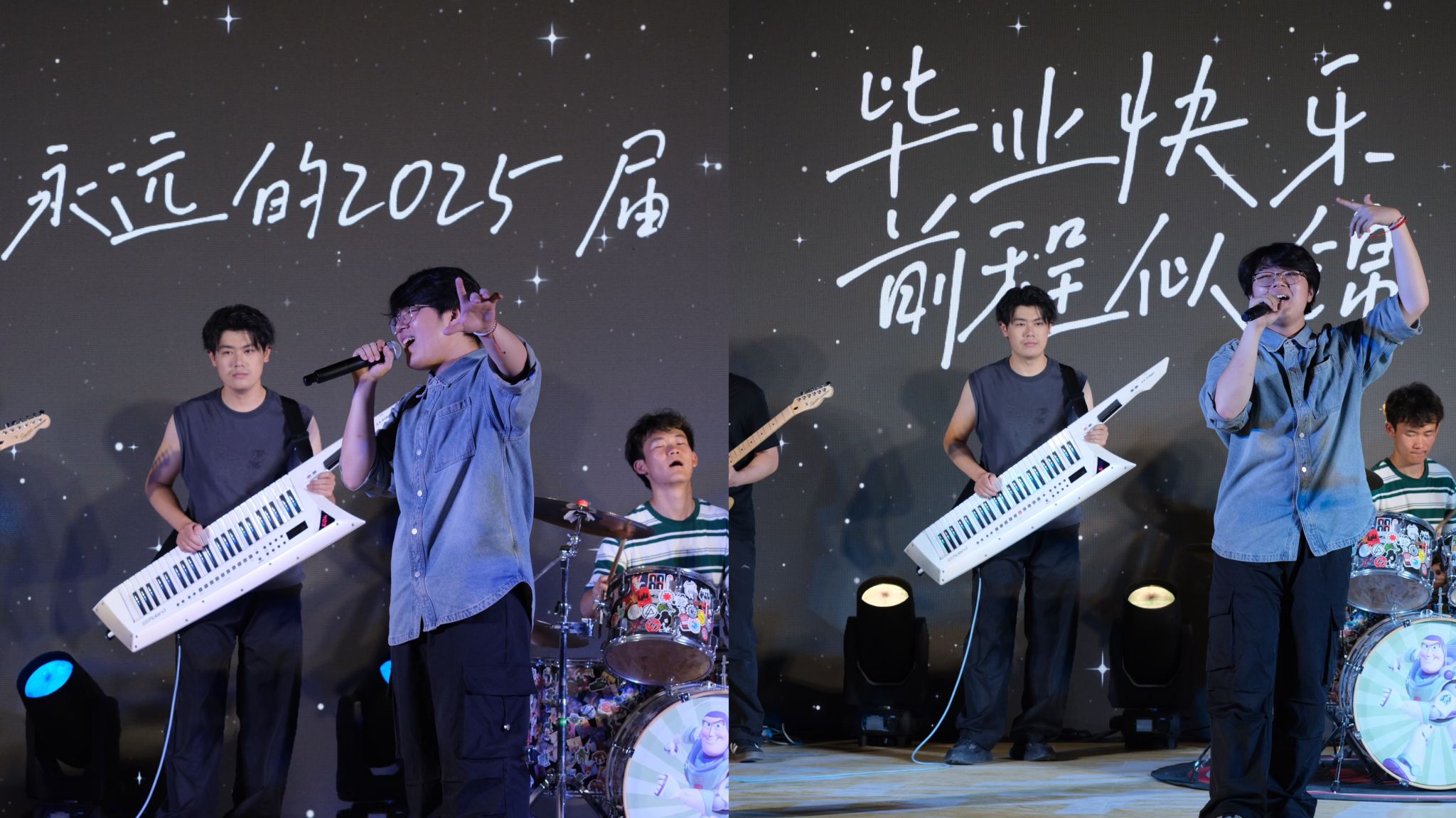 晚會(huì)以“青春印記”“青春路途”“青春永恒”三個(gè)篇章徐徐展開。舞臺(tái)之上,當(dāng)方向標(biāo)樂隊(duì)奏響《你要跳舞嗎》的第一個(gè)音符,整個(gè)夏夜瞬間被點(diǎn)燃。《七里香》《匆匆那年》的歌詞被學(xué)子們輕聲跟唱,閃爍的手機(jī)燈光如星河傾瀉,串聯(lián)起校園歲月的珍貴片段;當(dāng)《我們的明天》的旋律在夜空下回蕩,所有的離別都化作期許,青春的故事永不落幕,我們的篇章終將繼續(xù)書寫;《總有一天你會(huì)出現(xiàn)在我的身邊》,那些未曾說出口的告白在音符間靜靜流淌。舞臺(tái)之下,此起彼伏的“人浪”與歡呼聲交織成夏夜最動(dòng)人的和聲,仿佛要把這最后的相聚時(shí)光永遠(yuǎn)鐫刻在記憶里。