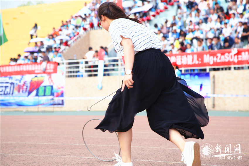 大學生組男女混合滾鐵環(huán)項目于上午8:35舉行,共10隊分兩組舉行,選手來回接力滾鐵環(huán),鐵環(huán)掉落或者亂道都會導致名次落后。選手們來回穿梭,鐵環(huán)快速旋轉沖向終點。一名比賽完的女同學說:“盡管我鐵環(huán)掉落,但是我還是必須重新出發(fā),奔向終點。”這種趣味性的項目同樣體現(xiàn)著堅持不懈的體育精神。最終,機電學院榮獲第一名。